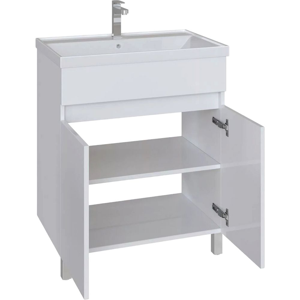 Тумба SanStar Квадро 70 представлена в напольном исполнении, ее размеры составляют 66,4x43,8x80 см. Она выполнена из ЛДСП с ламинатным покрытием, а фасады украшены пленочным покрытием на основе МДФ. Модель оснащена несъемными внутренними полками и доводчиком для плавного закрывания дверок. Гарантия на тумбу составляет 3 года.