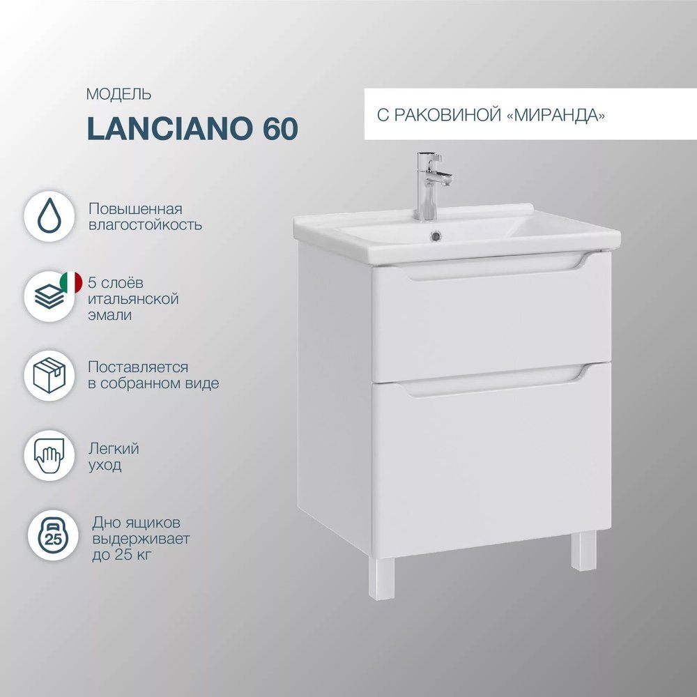 Тумба SanStar Lanciano 60 поставляется в напольном исполнении с общими габаритами 56,6 на 45,1 на 80 см. Каркас выполнен из прочного ламинированного ЛДСП, а фасад — из МДФ, покрытого пленкой, что усиливает защиту от влаги и механических повреждений. В комплект входит фарфоровая раковина Santek Миранда 60, шириной 60 см и глубиной 45 см, с одним отверстием под смеситель и возможностью установки слива-перелива, который необходимо приобрести отдельно. Внутреннее наполнение включает удобные ящики с доводчиками для комфортного использования. Раковина имеет 10-летнюю гарантию, а тумба — гарантию на 3 года. Произведено в России.