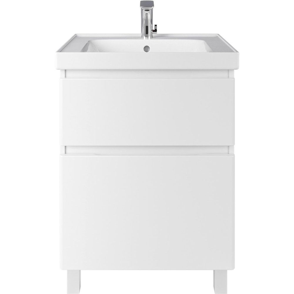 Вашему вниманию представлена напольная тумба SanStar Riana 60, выполненная из прочного ЛДСП с эмалевым покрытием. Эстетичный фасад из МДФ с пленочным покрытием добавляет модели современный вид. Хромированная фурнитура подчеркивает утончённость дизайна. Габариты тумбы составляют 56,6 см в ширину, 45,1 см в глубину и 80 см в высоту. Тумба крепится к стене для надежности и опирается на устойчивые ножки. В комплектацию входит фарфоровая раковина от Dreja с размерами 60,4 см на 46,8 см, оснащённая встроенным сливом-переливом и имеющая одно отверстие под смеситель.