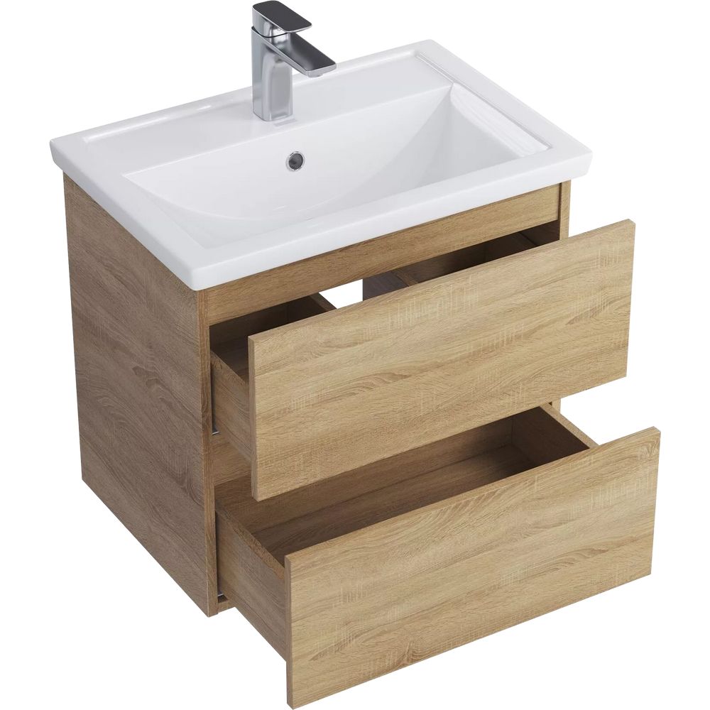 Тумба для комплекта SanStar Тоскана 60, выполненная в светлом оттенке дуба сонома, является подвесной и имеет размеры 56,4x38,6x52 см. Она оснащена механизмом доводчика для плавного закрытия, а корпус изготовлен из ЛДСП с ламинатным покрытием. Фасад тумбы - из МДФ, покрыт пленкой для увеличения прочности и долговечности.