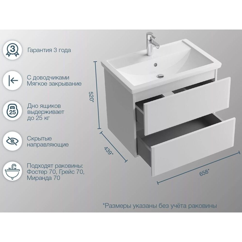 Тумба для комплекта SanStar Велья 70 характеризуется размерами 65,8x43,9x52 см и подвесной конструкцией, обеспечивающей удобство доступа и легкость уборки напольного пространства. Корпус из ЛДСП и МДФ покрыт устойчивой пленкой. Встроенные доводчики гарантируют плавное закрывание ящиков и увеличивают срок службы изделия. Гарантия производителя составляет 3 года, а производство осуществляется в России.