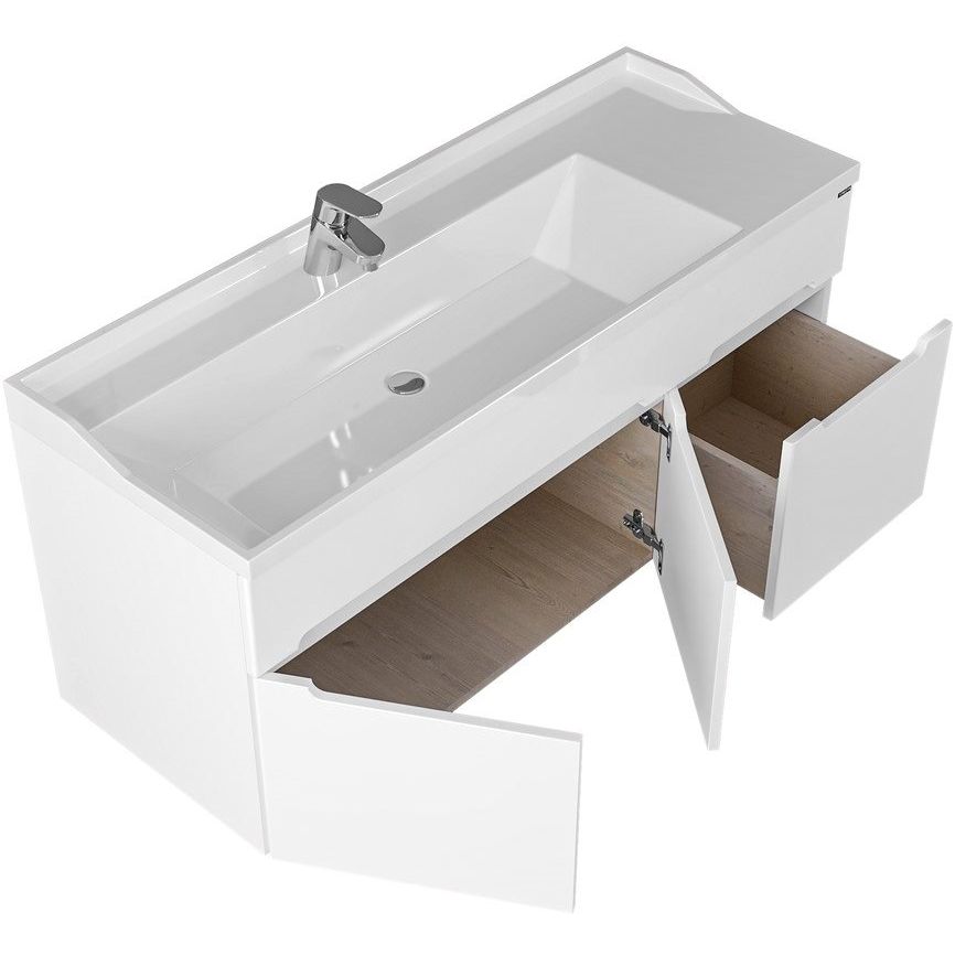 Мебель поставляется в собранном виде, что упрощает процесс установки. Обратите внимание, что столешница тумбы не имеет предустановленного отверстия под смеситель, что дает возможность выбрать индивидуальное расположение. При подборе сифона учитывайте особенности конструкции тумбы для корректного выбора.