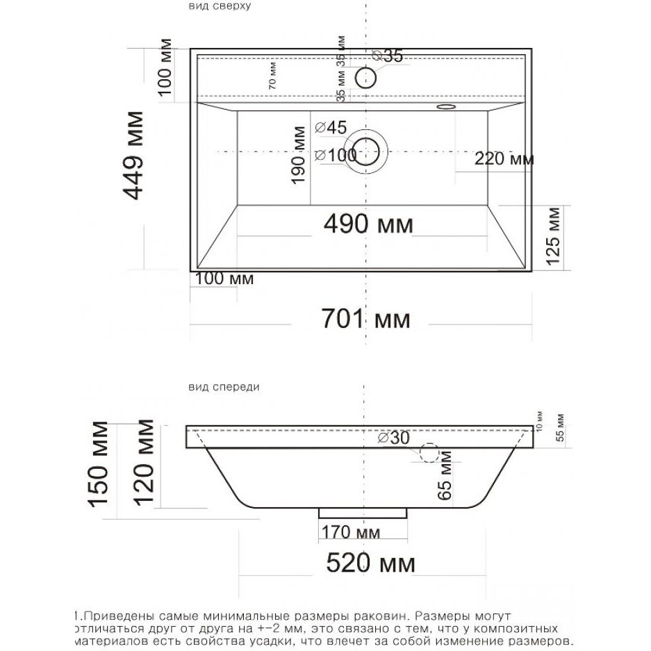 Мебельная раковина СанТа Classic 70 имеет размеры 70,1x44,9 см, выполнена из искусственного мрамора и оснащена слив-переливом. Диаметр отверстия для сифона - 3,2 см. Предусмотрено одно готовое отверстие для смесителя, а также в комплект входит необходимая арматура для слива-перелива. На раковину также предоставляется гарантия 1 год.