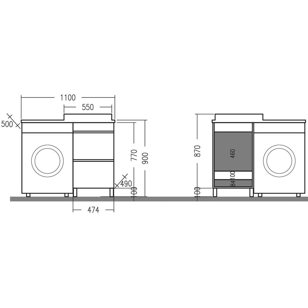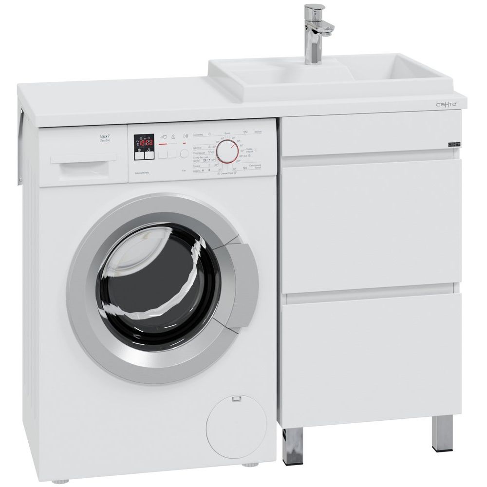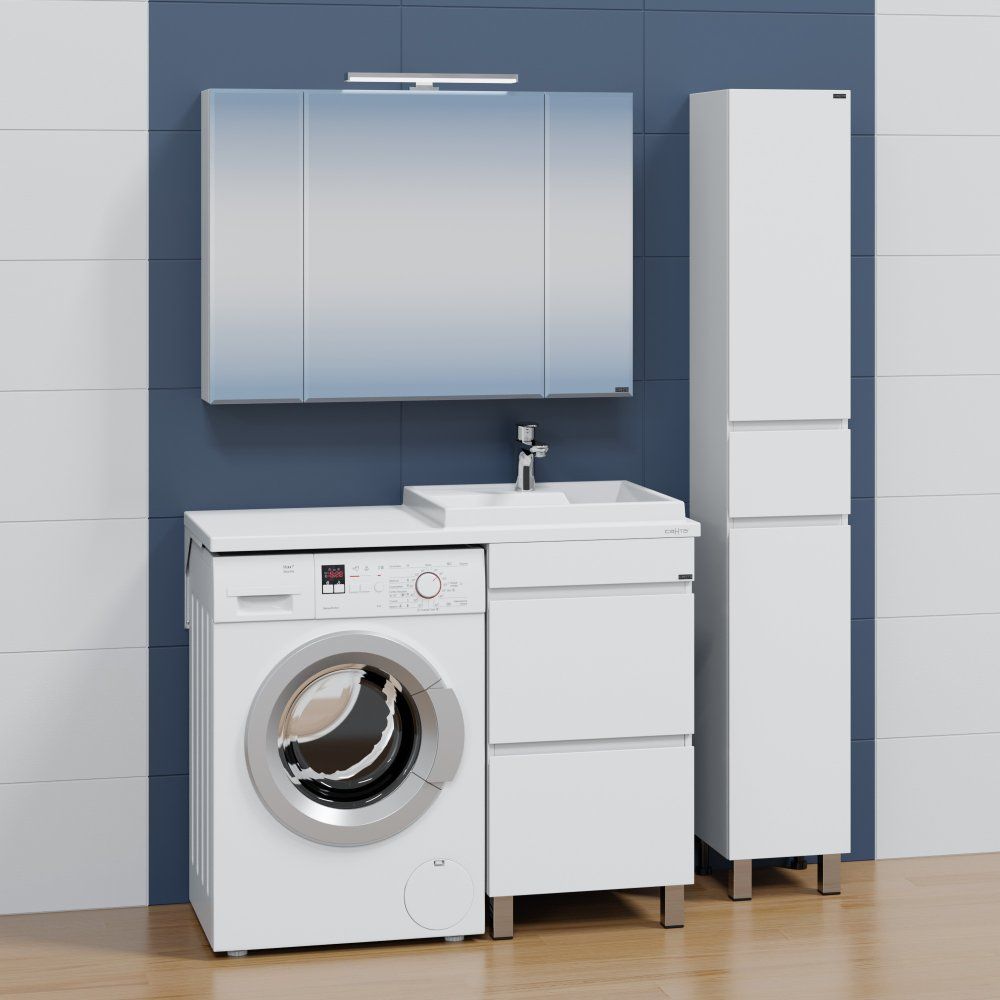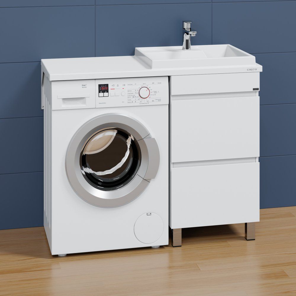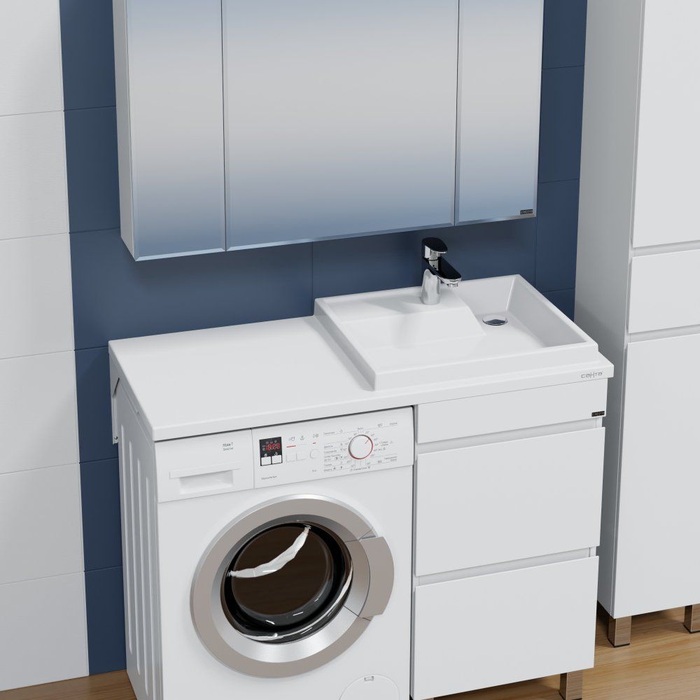 - Совмещает функцию тумбы и раковины, при этом оставляя пространство для стиральной машины.