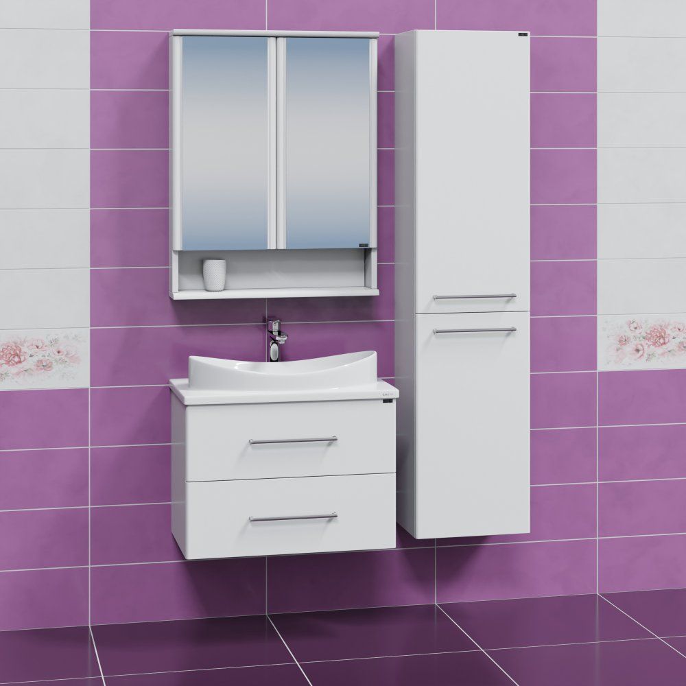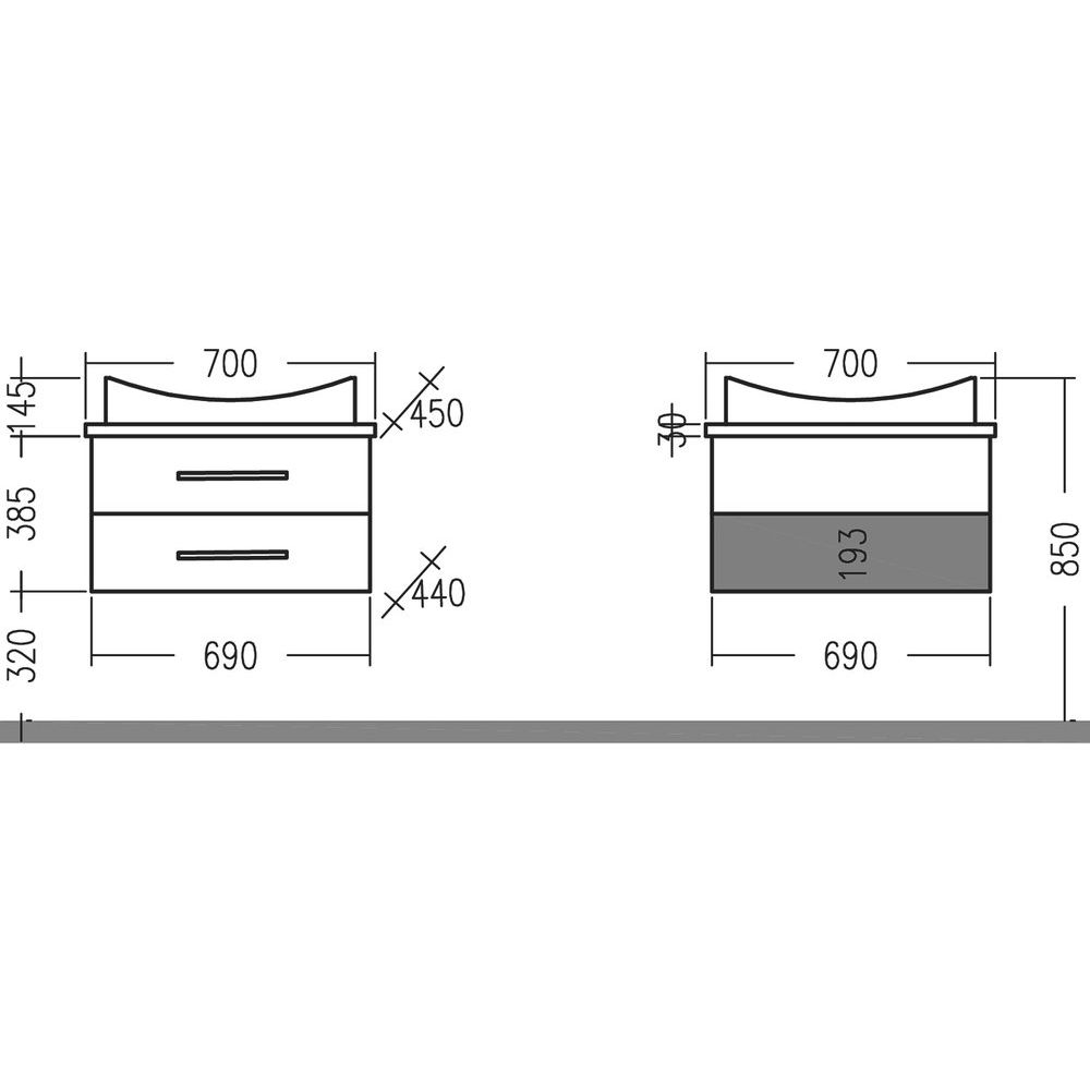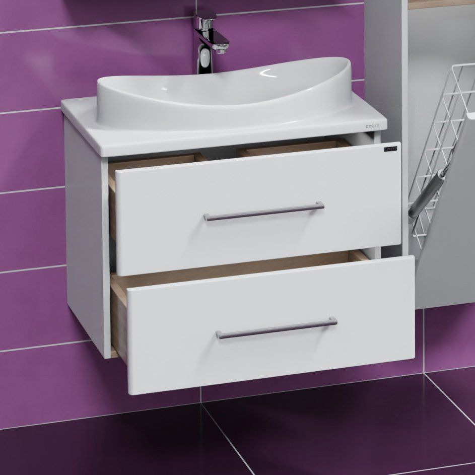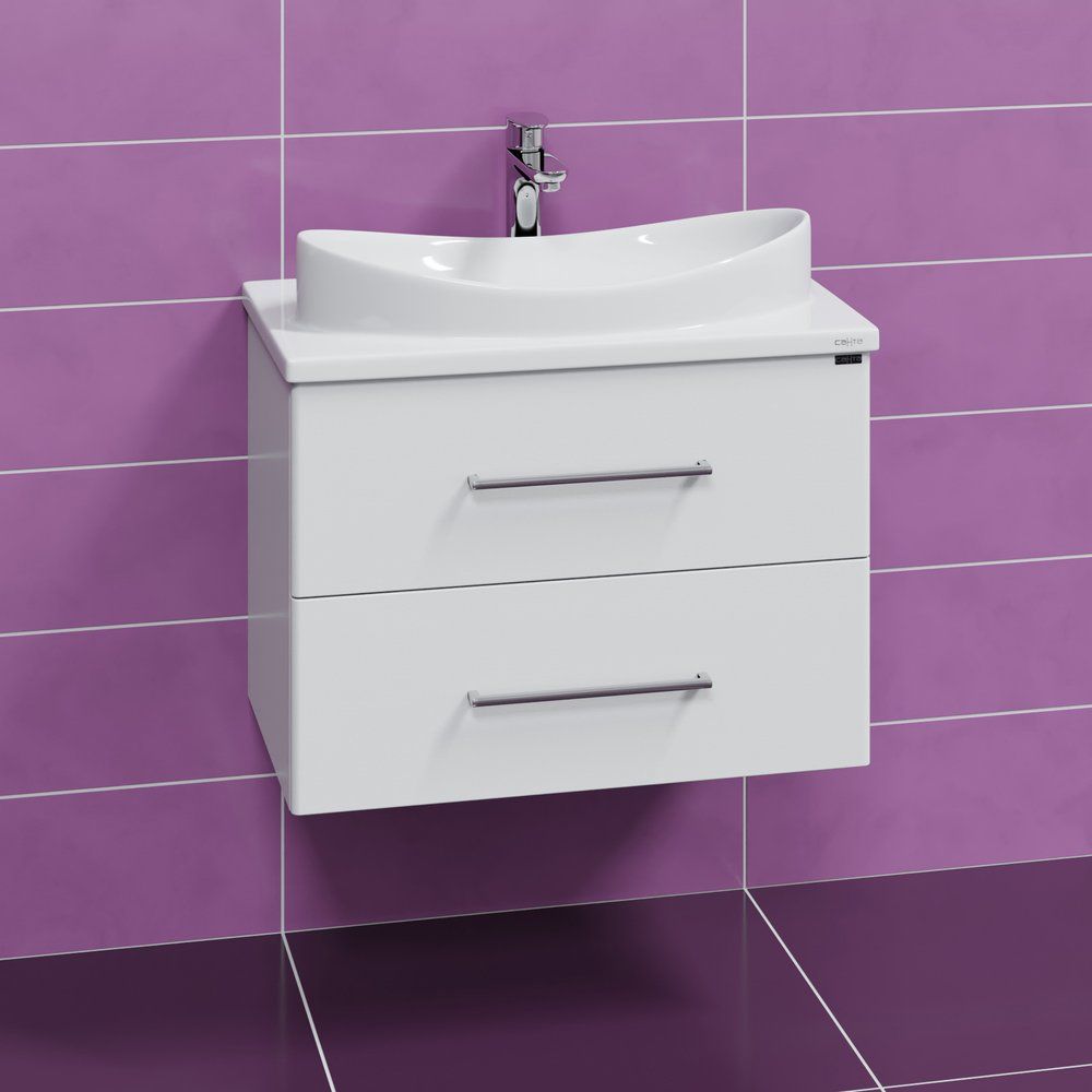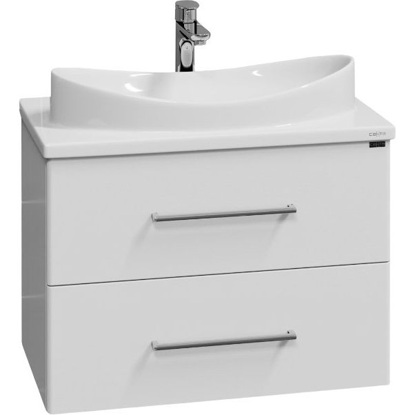 Тумба СанТа Вегас 70 обладает размерами 69x44x38,5 см и подвесной установкой, обеспечивающей удобный доступ к пространству под ней. Корпус и фасады выполнены из МДФ и покрыты пленкой, что придаёт поверхности стойкость к влаге и механическим воздействиям. Два ящика оснащены механизмом доводчика для плавного закрывания. Цвет хромированной фурнитуры прекрасно сочетается с общим дизайном.