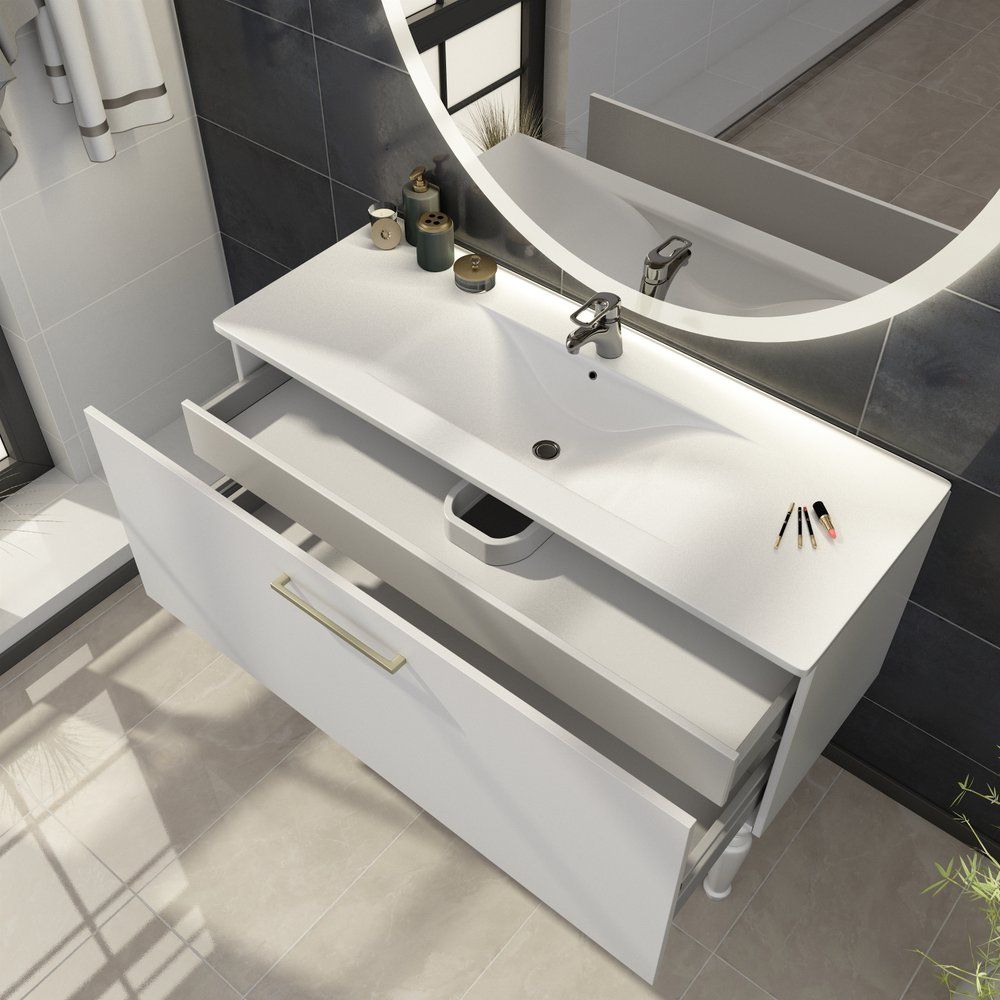 - Подвесная конструкция тумбы позволяет экономить пространство и упрощает уборку.