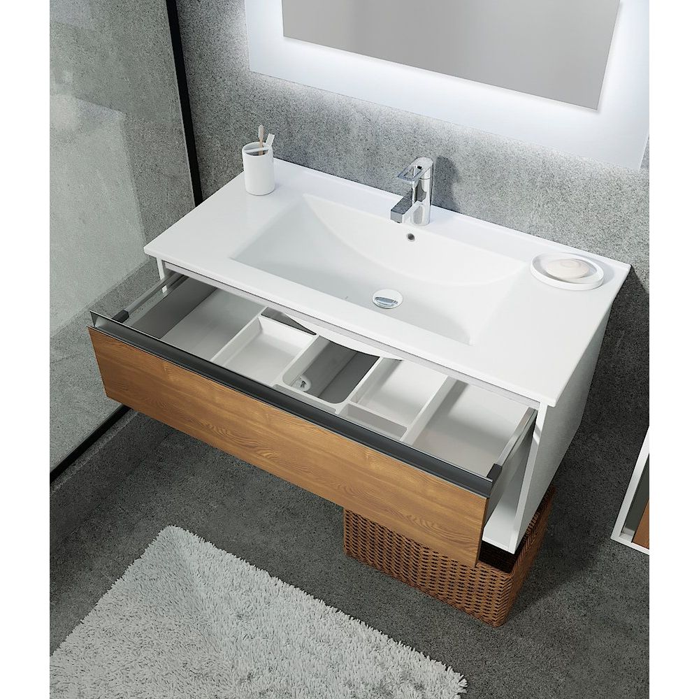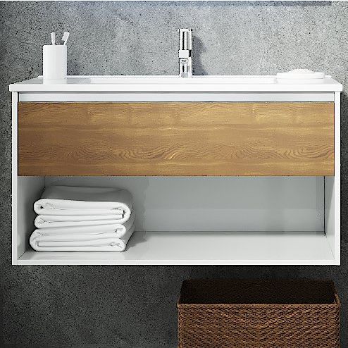 Тумба Sanvit Контур 90 имеет размеры 89x46x50 см и подвесную конструкцию, что облегчает уборку. Ящики оснащены механизмом доводчика для плавного закрывания. Корпус и фасад выполнены из МДФ с пленочным покрытием, устойчивым к внешним воздействиям. В комплекте также идет мебельная раковина Sanvit 9090 D с габаритами 91x46 см, изготовленная из фаянса, в которую встроены слив-перелив и предусмотрено отверстие для смесителя. Гарантия на тумбу составляет 1 год, а на раковину - 5 лет.