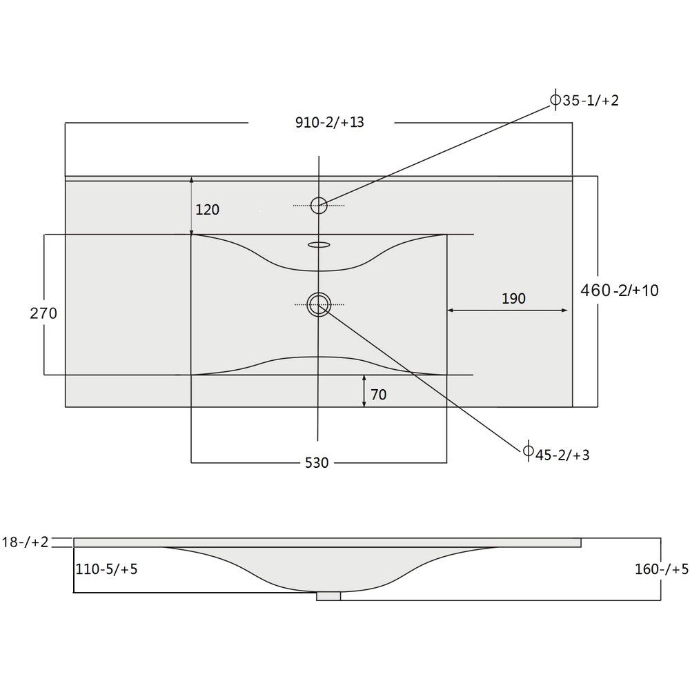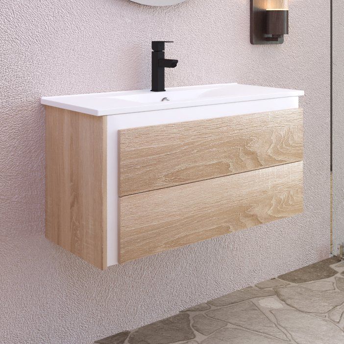 Корпус тумбы выполнен из ламинированного ЛДСП с фасадом из МДФ и ЛДСП, что обеспечивает высокую прочность и долговечность. Подвесная тумба размером 90x46x50 см оборудована ящиками с нажимным механизмом и механизмом доводчика для плавного закрывания. Тумба дополнена белой вставкой из МДФ, расширяющей визуальное пространство. Раковина из фаянса размером 91x46 см имеет встроенный слив-перелив и одно готовое отверстие под смеситель. Китайская раковина снабжена пятилетней гарантией, а тумба — годичной гарантией от производителя в России.