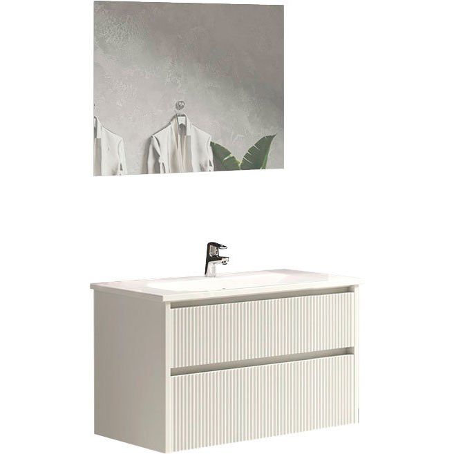 В составе комплекта — тумба и мебельная раковина. Тумба Sanvit 80 белая имеет размеры 79x46x50 см, подвесная конструкция и механизм доводчика для плавного закрывания. Корпус и фасады выполнены из МДФ с пленочным покрытием, с объемной фрезеровкой на фасаде. Мебельная раковина Sanvit 9080 D изготовлена из фаянса, с размерами 81x46 см, оснащена встроенным сливом-переливом и требует отдельно приобретаемого донного клапана. Раковина имеет одно отверстие под смеситель и подходит для сифона диаметром 3.2 см.