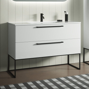 Тумба Sanvit Сити обладает размерами 100x46x50 см и выполнена из высококачественного МДФ, покрытого защитной пленкой. Черная фурнитура добавляет стильности, а также имеются дополнительные опорные ножки из алюминия. Мебельная раковина, изготовленная из фаянса, имеет размеры 101x46 см и оборудована встроенным сливом-переливом. В комплекте предусмотрены все необходимые отверстия для установки, включая одно под смеситель, однако донный клапан нужно приобретать отдельно.