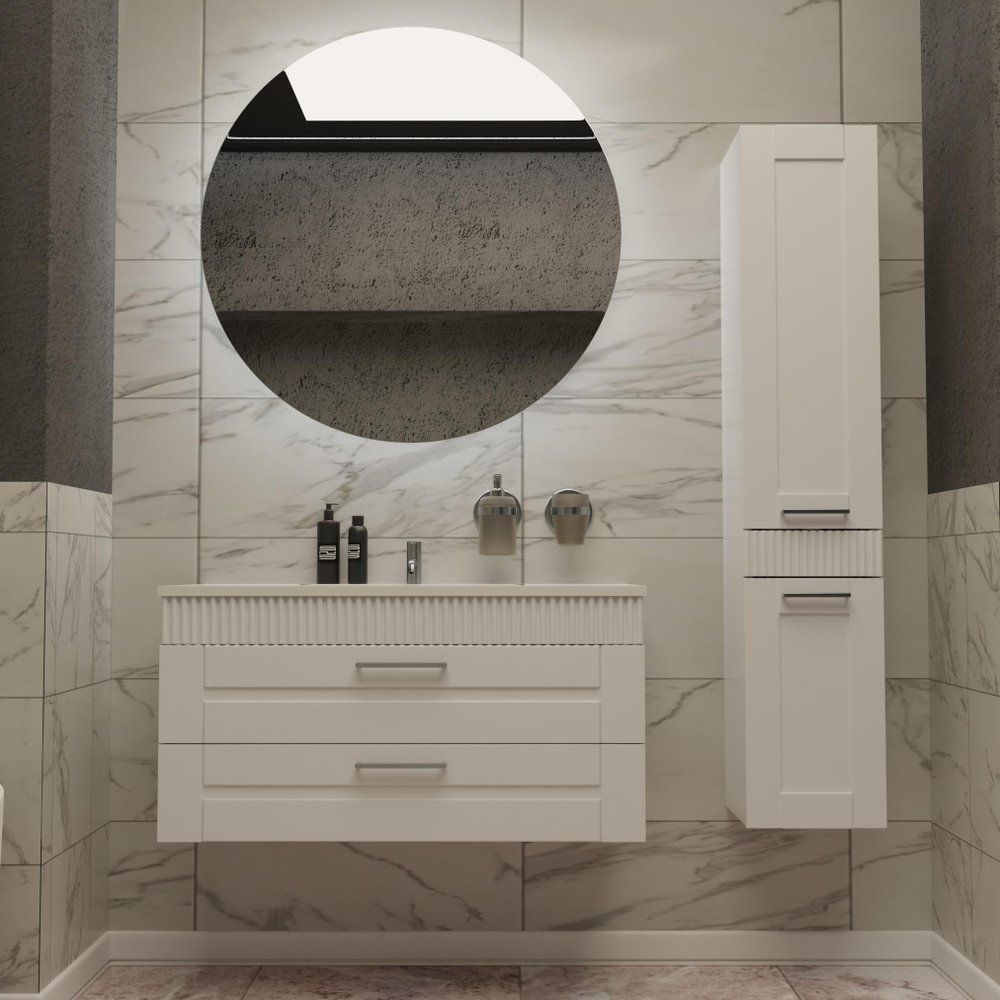 - Продуманная организация пространства: тумба с ящиками обеспечивает удобное хранение, а раковина с встроенным сливом позволяет избежать излишней шумихи.