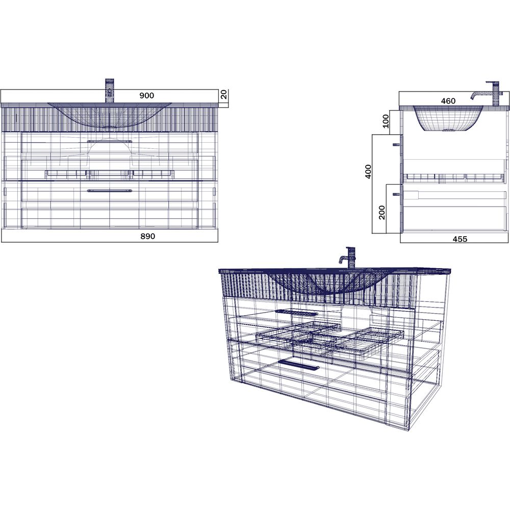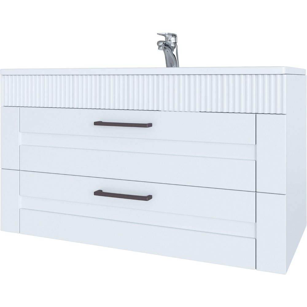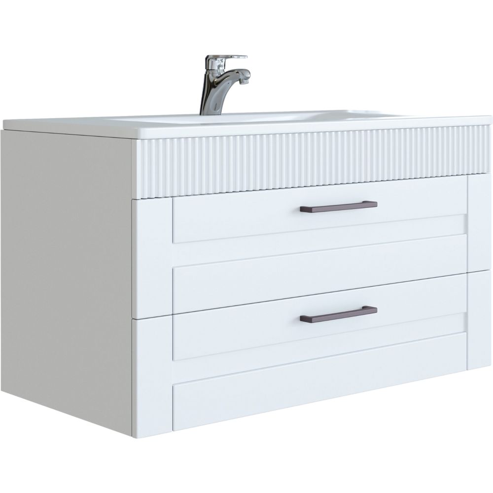 Тумба Sanvit Турин 2 90 имеет размеры 89х45,5х50 см и спроектирована как подвесная конструкция. Она оснащена механизмами доводчика для ящиков, что обеспечивает их плавное закрывание. Корпус и фасад изготовлены из МДФ и имеют пленочное покрытие, что гарантирует защиту от влаги и износа. Раковина Sanvit 9090 D из фаянса имеет размеры 91х46 см и оснащена встроенным сливом-переливом. В комплекте предусмотрен одно отверстие для смесителя, но донный клапан приобретается отдельно.
