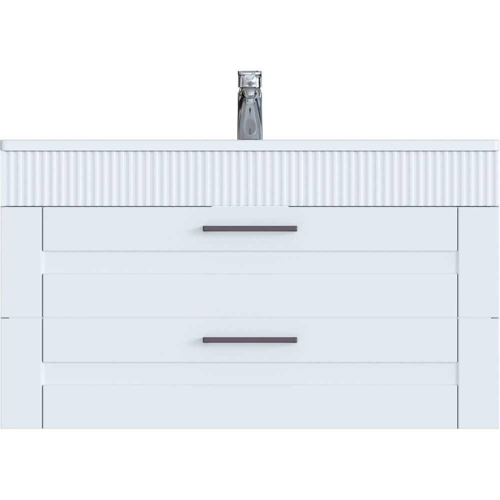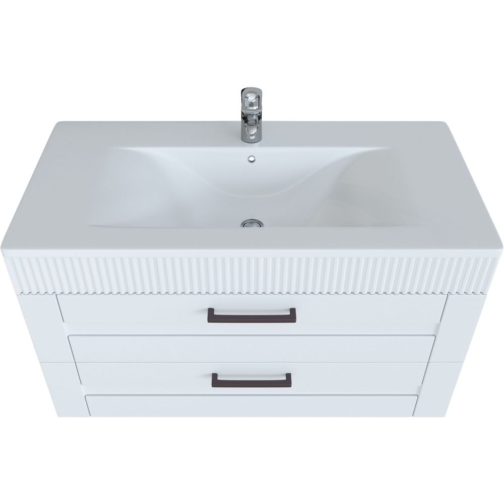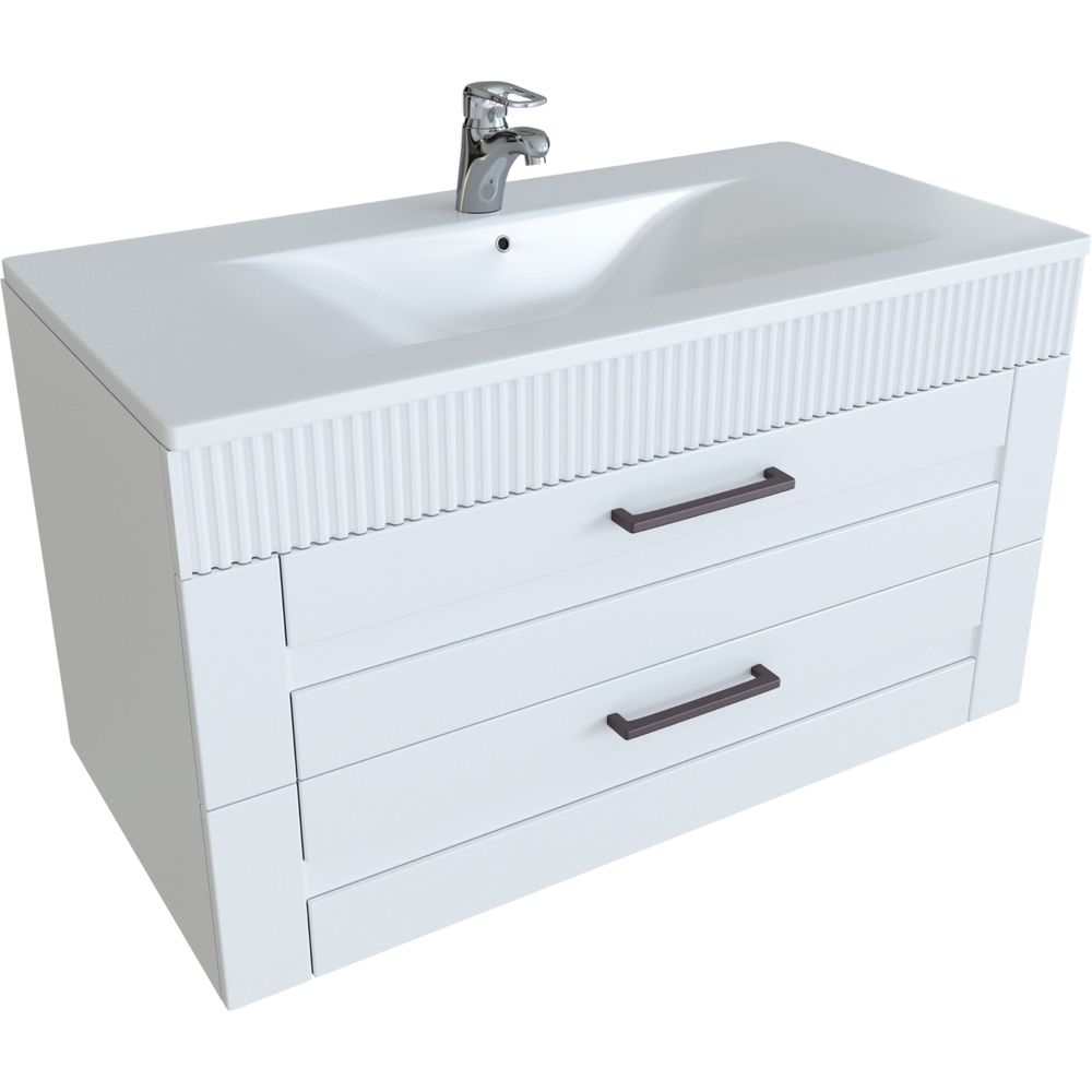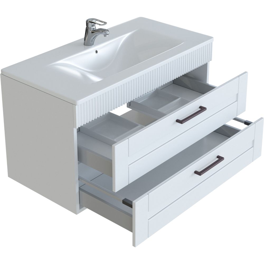 Тумба Sanvit Турин 2 90 имеет размеры 89х45,5х50 см и спроектирована как подвесная конструкция. Она оснащена механизмами доводчика для ящиков, что обеспечивает их плавное закрывание. Корпус и фасад изготовлены из МДФ и имеют пленочное покрытие, что гарантирует защиту от влаги и износа. Раковина Sanvit 9090 D из фаянса имеет размеры 91х46 см и оснащена встроенным сливом-переливом. В комплекте предусмотрен одно отверстие для смесителя, но донный клапан приобретается отдельно.