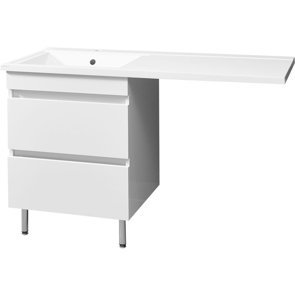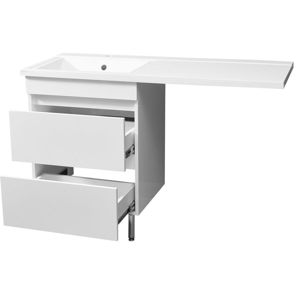 Тумба Stella Polar 130 под стиральную машину имеет размеры 69 см в ширину, 48 см в глубину и 85 см в высоту, что делает её идеальным напольным решением для ванной комнаты. Оснащена ящиками с доводчиком для мягкого закрывания и выполнена из ЛДСП с пленочным покрытием. Раковина Stella Polar Мадлен 130 L, изготовленная из искусственного мрамора, почти 130 см в ширину и 48,2 см в глубину, имеет одно подготовленное отверстие для смесителя. Возможно расположение над стиральной машиной с обязательным учётом диаметра сифона в 3.2 см. Кронштейн, необходимый для установки раковины, изготовлен из стали и поддерживается гарантией одного года. Все элементы производятся в России, что подтверждает высокое качество и надежность изделий.