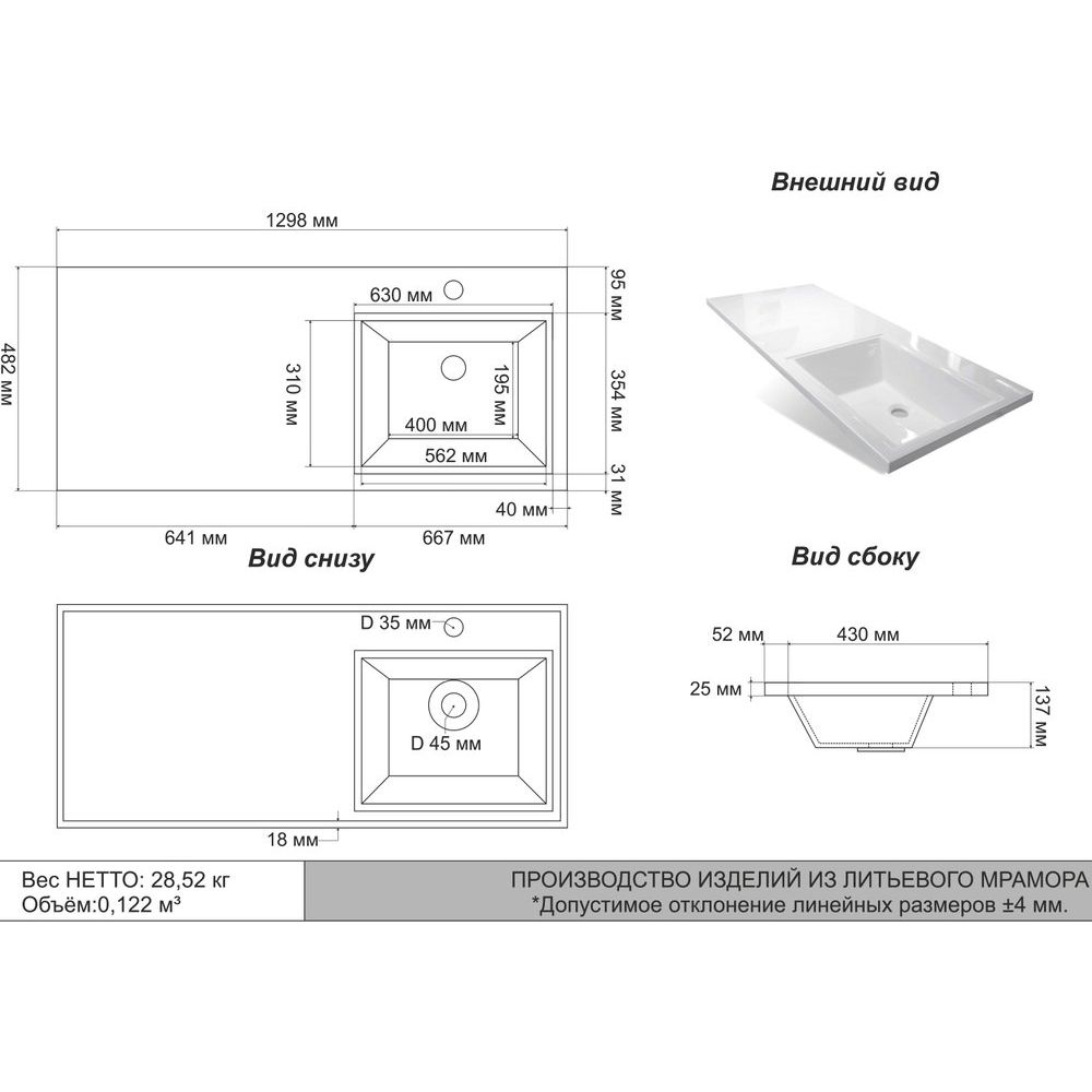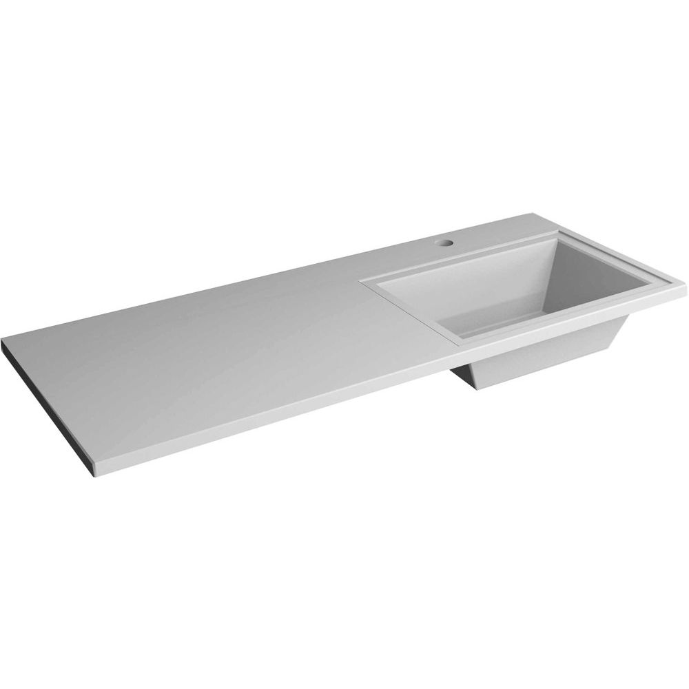 Мебельная раковина шириной почти 130 см выполнена из искусственного мрамора и имеет одно готовое отверстие под смеситель. Она идеально подходит для установки над стиральной машиной. Дополнительно требуется приобретение донного клапана.