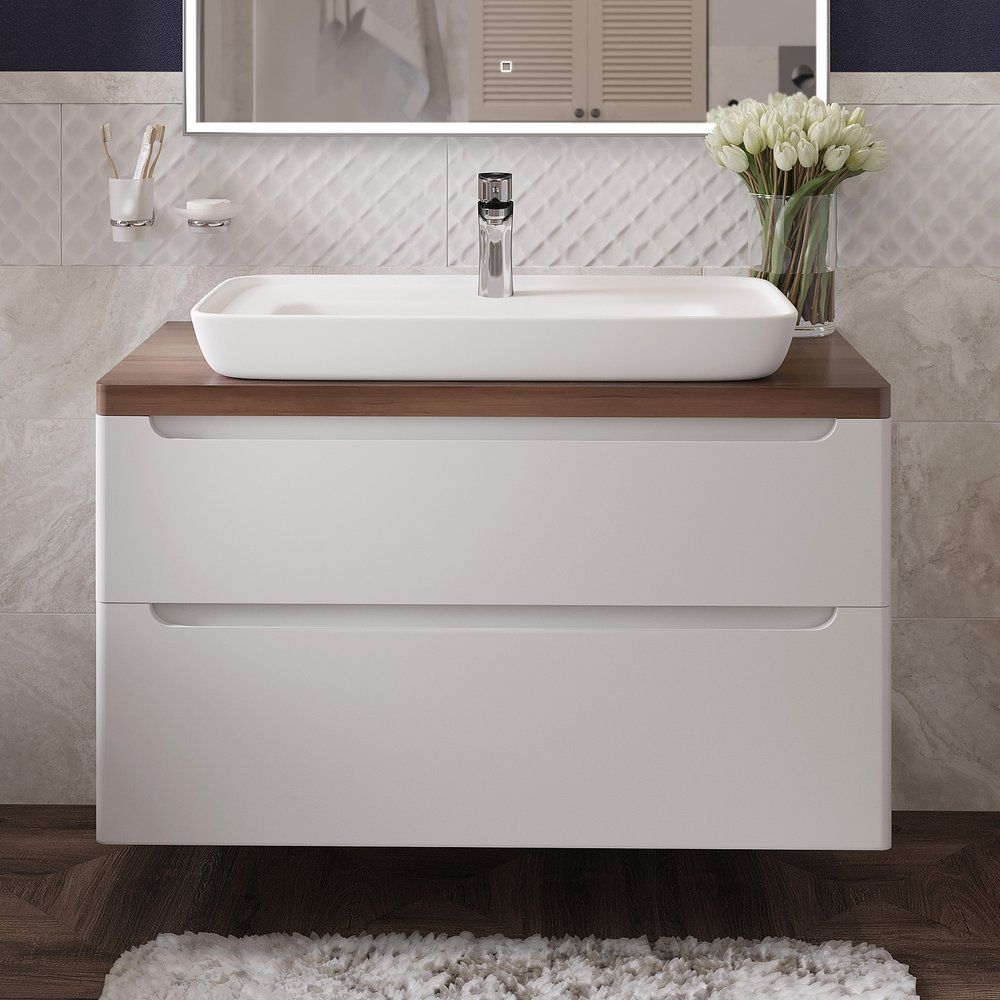 Тумба STWORKI Берген 100 выполнена в белом цвете и имеет габариты 99,5x51,5x56 см. Она оснащена ящиками и подвесной системой крепления, что значительно облегчает уборку в ванной комнате. Корпус и фасад тумбы изготовлены из надежного МДФ с прочной пленочной поверхностью. Особенностью тумбы является встроенный механизм доводчика для плавного закрывания. Гарантия на изделие составляет 2 года, страна производства — Россия.