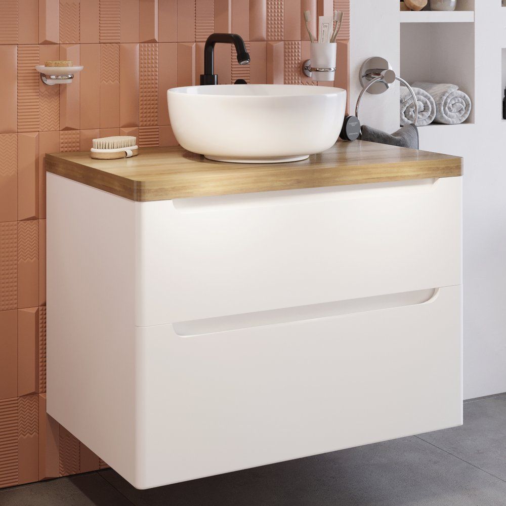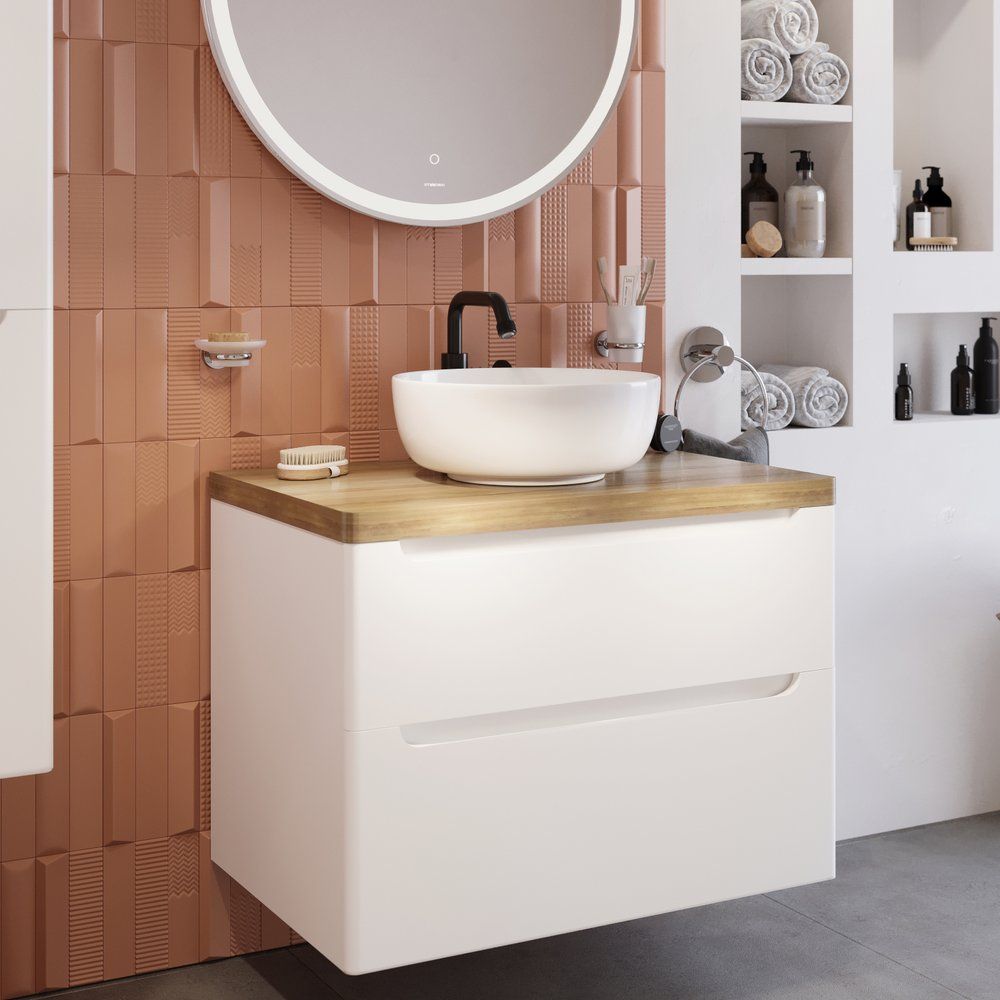 Тумба с раковиной STWORKI Берген 80 — это стильный и функциональный выбор для вашей ванной комнаты. Эта комбинация соединяет в себе нежную эстетику белоснежного фасада и теплую текстуру светлой деревянной столешницы. Подвесная конструкция не только экономит пространство, но и облегчает уборку, придавая вашей ванной комнате современный вид.