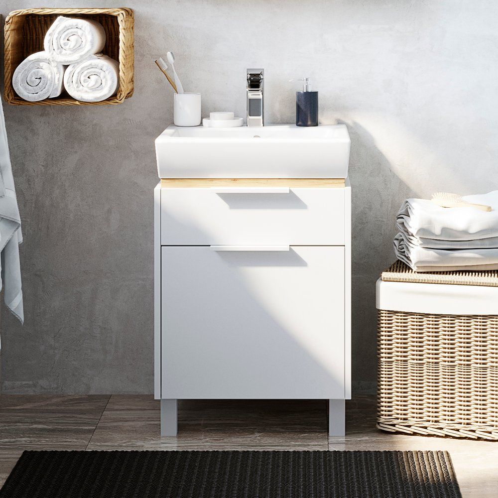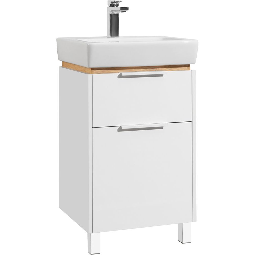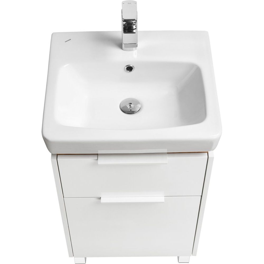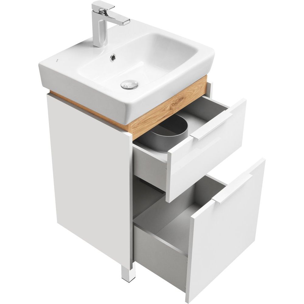 Узкая подвесная тумба для ванной комнаты Stworki «Дублин 50» — это идеальное решение для размещения в компактных пространствах, благодаря своему высококлассному скандинавскому дизайну. Глянцевый белый фасад в сочетании с матовыми белыми ручками подчеркнут вашей ванной комнате стиль и изысканность. Практичные и не ржавеющие со временем ручки, а также декоративные ножки создают дополнительную устойчивость и визуально обогащают интерьер. Два ящика, оснащённые надежными механизмами доводчиков, обеспечивают плавное и бесшумное закрывание, надежно скрывая от посторонних глаз предметы гигиены. Основной корпус выполнен из влагостойкой ДСП и защищён финишным покрытием по специальной технологии УФ-отверждения, что обеспечивает устойчивость к влаге и пару. Добавьте к этому элегантную прямоугольную фаянсовую раковину с площадкой под смеситель и получите идеальную тумбу для ванных в стиле модерн.