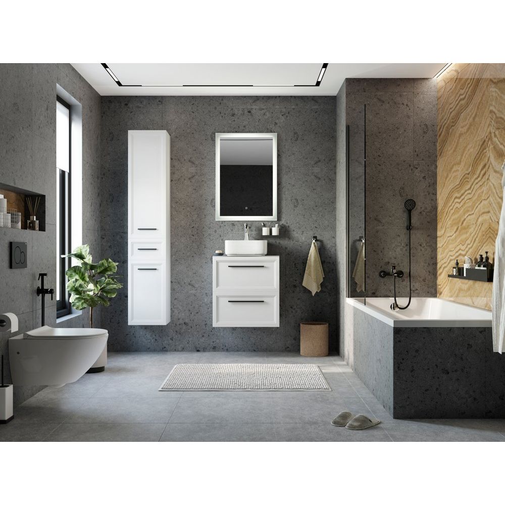 Тумба для комплекта STWORKI Эстерсунд 60 с белым матовым покрытием идеально подходит для современных ванных комнат. Она имеет размеры 59,6x46,3x63 см и выполнена из качественного ДСП с эмалью и ламинатом. Оснащена чёрной фурнитурой и системой плавного закрывания ящиков. Столешница из простоуна без отверстий под смеситель выполнена из прочного керамогранита и имеет размеры 60.6x46.5x1.1 см. Мебельная раковина из фарфора имеет одно готовое отверстие под смеситель и рассчитана на сифон диаметром 3.2 см. Гарантия на раковину действует 5 лет.