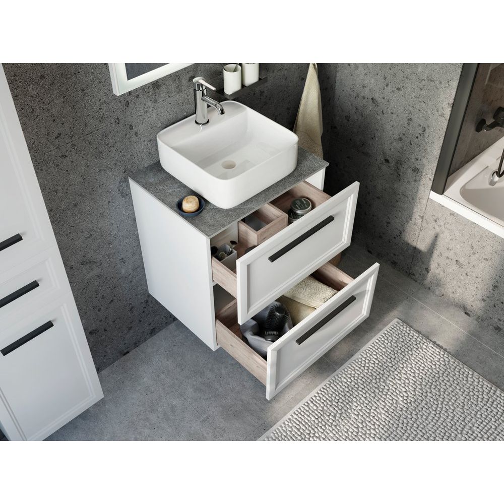 Тумба STWORKI Эстерсунд 60 – это подвесная конструкция с габаритами 59,6x46,3x63 см. Изготовлена из ДСП с эмалированным и ламинированным покрытием, фасады – из эмалированного МДФ. В комплекте идет столешница из серого керамогранита размером 60,6x46,5x1,1 см и фарфоровая раковина STWORKI City 2 с габаритами 39x39 см. Все изделия произведены в России и покрыты гарантией на срок от 2 до 5 лет в зависимости от элемента.