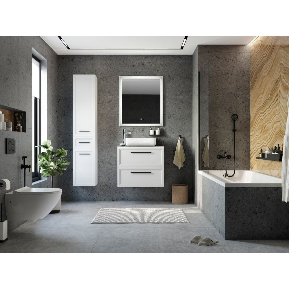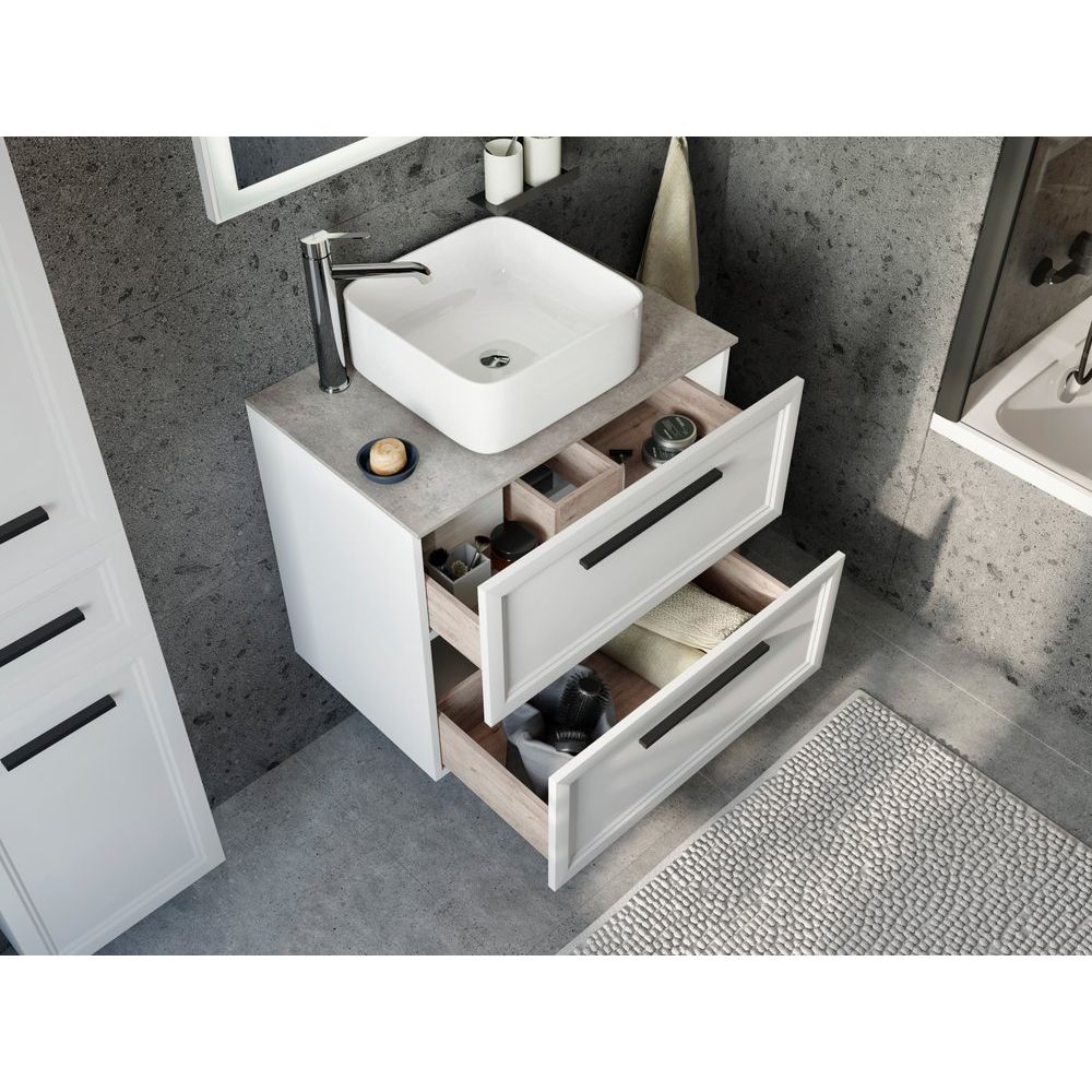 Тумба STWORKI Эстерсунд 75 имеет габариты 73,5х46,3х63 см и выполнена в подвесном варианте, что позволяет рационально использовать пространство. Белая матовая тумба произведена из ДСП с покрытием эмалью и ламинатом, а фасад — из МДФ, покрытый эмалью. Ящики оснащены черной фурнитурой и механизмами доводчика для плавного закрытия. Столешница из прочного керамогранита бежевого цвета имеет размеры 75,6х46,5х1,1 см и уже подготовлена под смеситель. Раковина STWORKI City 1 выполнена из фарфора, ее размеры составляют 38,5х38,5 см, и она поддерживает сифон диаметром 3,2 см.