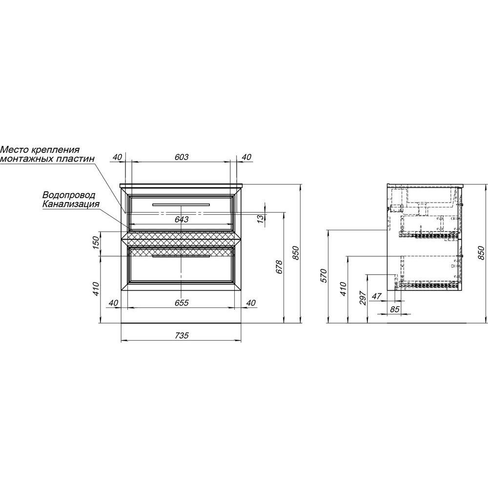 Мебель поставляется в собранном виде, что сокращает время монтажа и предотвращает ошибки сборки. При выборе сифона важно учитывать особенности конструкции данной тумбы – его необходимо подбирать индивидуально, исходя из параметров раковины. Также донный клапан необходимо приобрести отдельно. Несмотря на готовое отверстие для смесителя в столешнице, отверстия под дополнительные компоненты не предусмотрены.