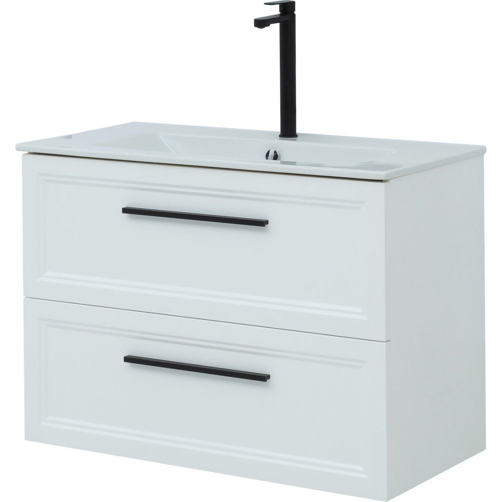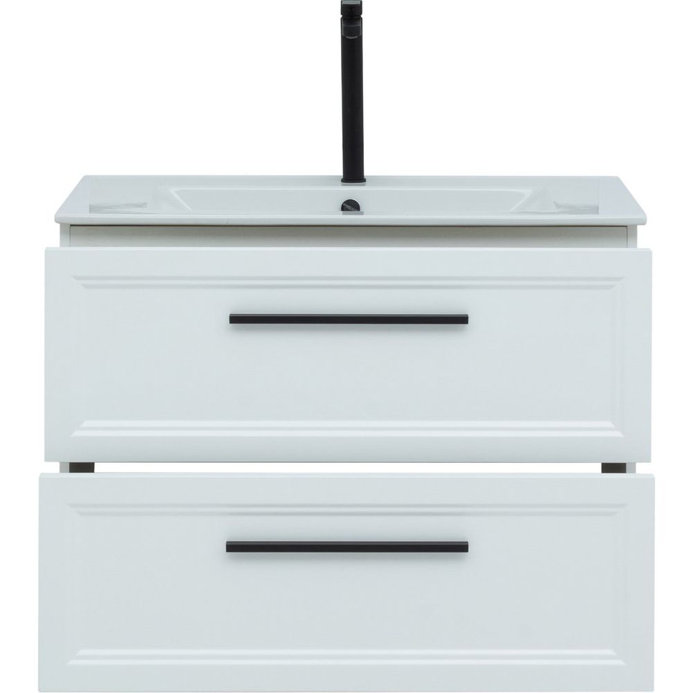 - Качественные материалы — тумба из ДСП и МДФ с эмалевым покрытием, раковина из фарфора.