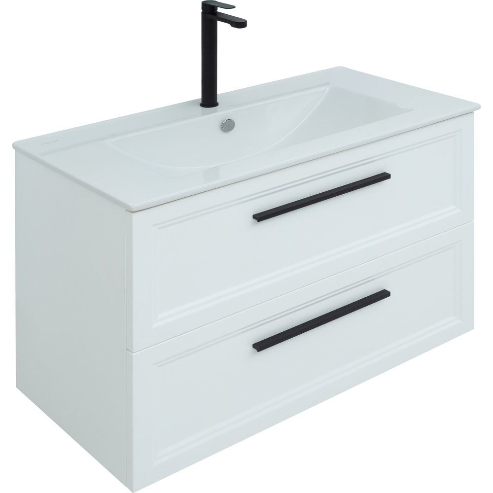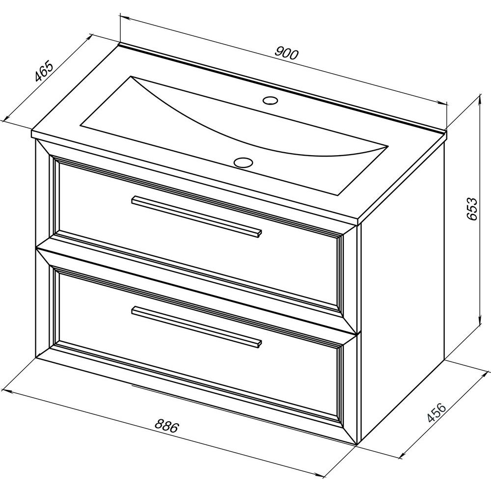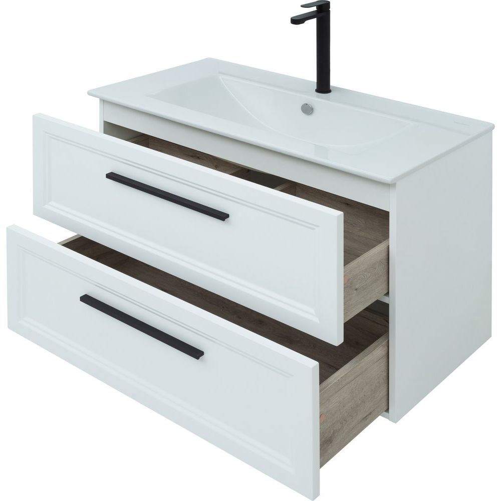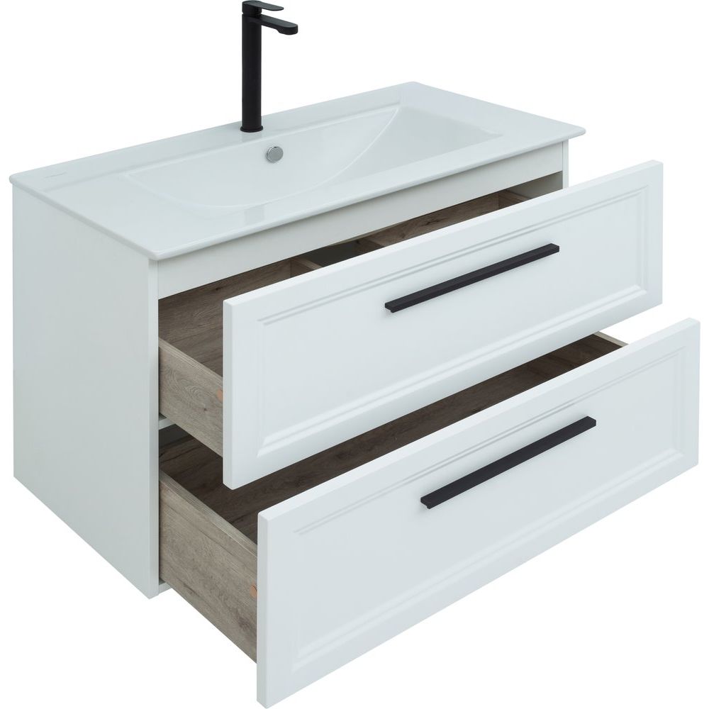 Тумба STWORKI Эстерсунд 90 имеет габариты 88,6x46,3x63 см и подвесную конструкцию, что создаёт лёгкость и стильный вид ванной комнаты. Она выполнена из прочного ДСП с покрытием из эмали и ламината, а фасад — из МДФ с эмалевым покрытием. Для плавного закрывания ящики оснащены механизмом доводчика, а цвет фурнитуры — черный, что добавляет изысканность. Мебельная раковина STWORKI Quadro 90 выполнена из высококачественного фарфора с габаритами 90,3x47,5 см. Раковина имеет встроенный слив-перелив и одно отверстие под смеситель. Обратите внимание, что донный клапан необходимо приобрести отдельно. Раковина изготавливается в России и имеет 15 лет гарантии.