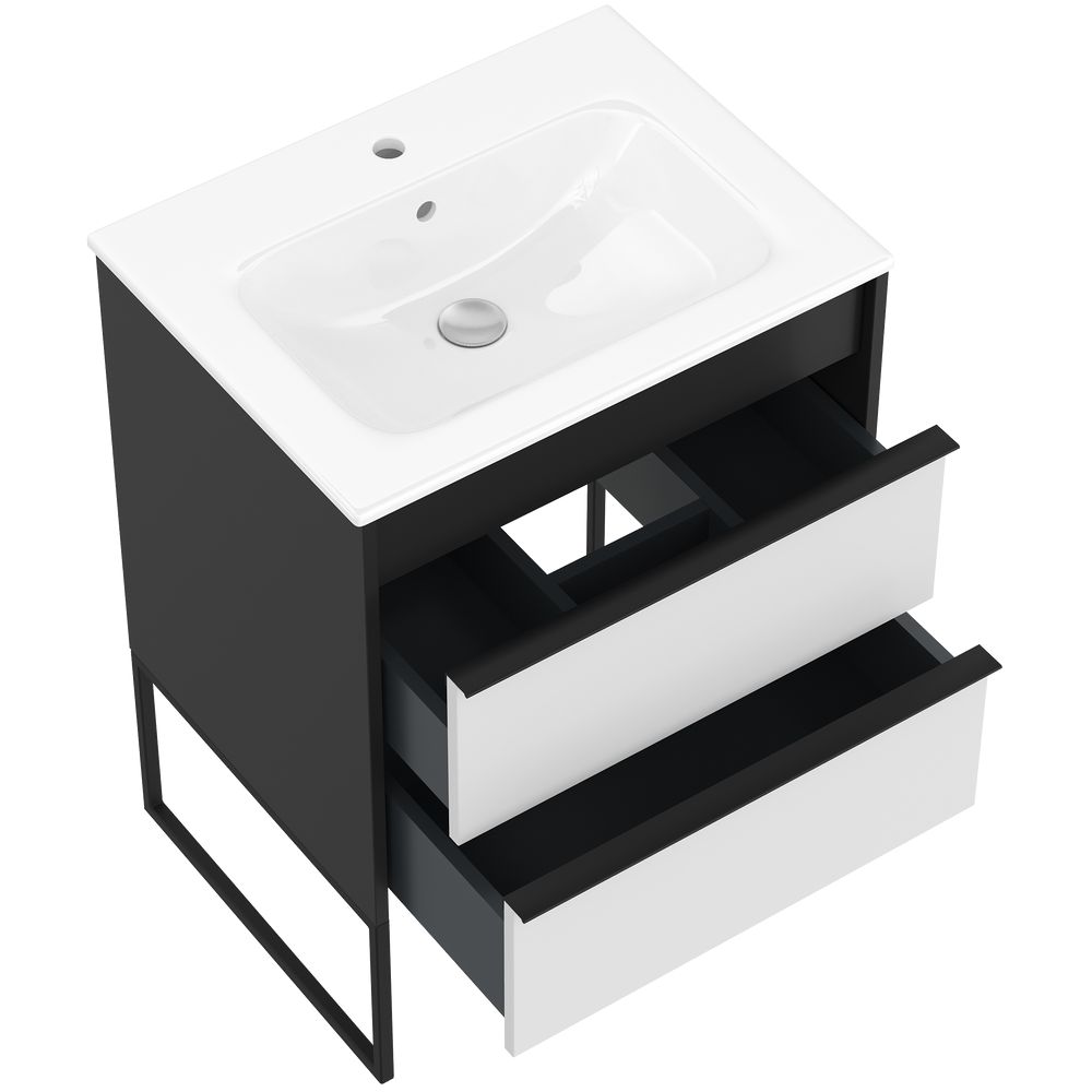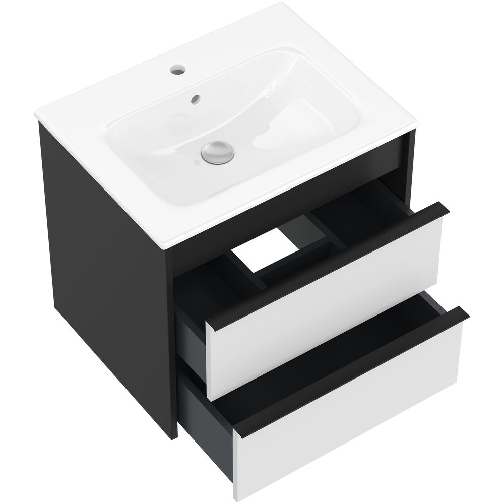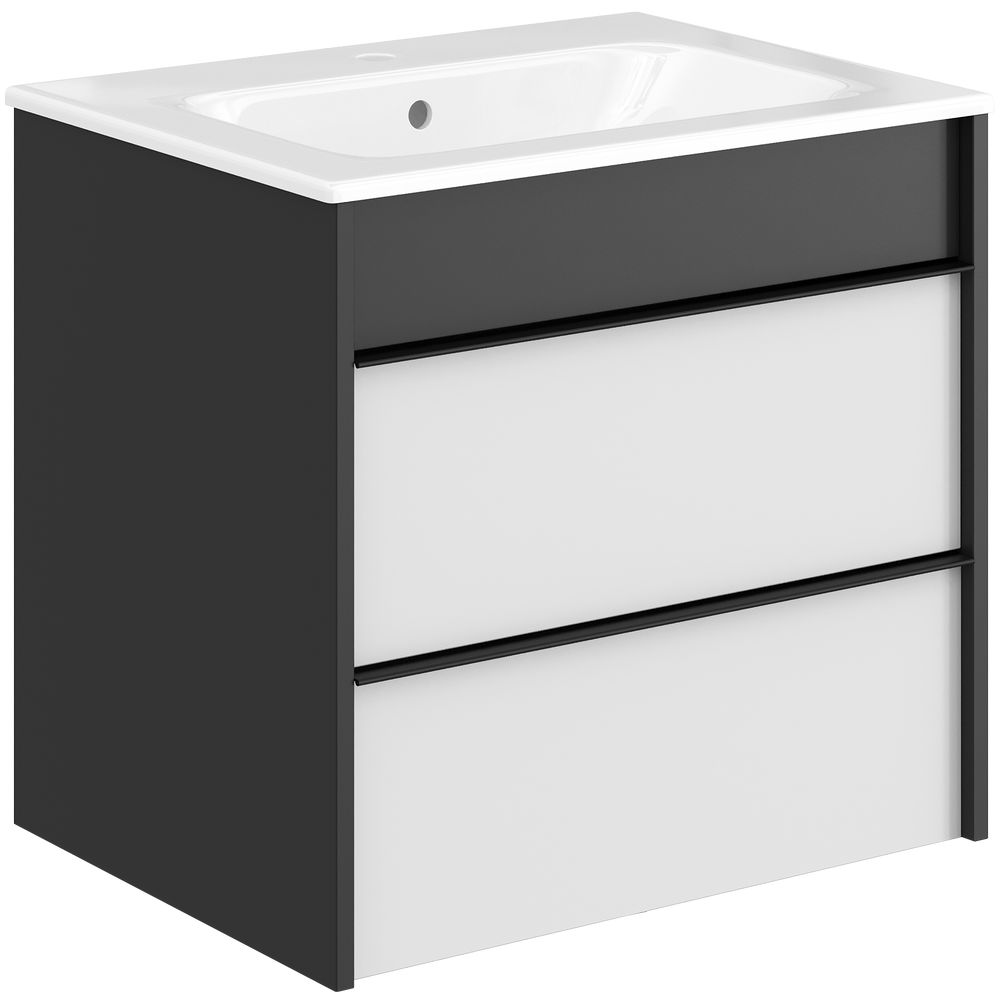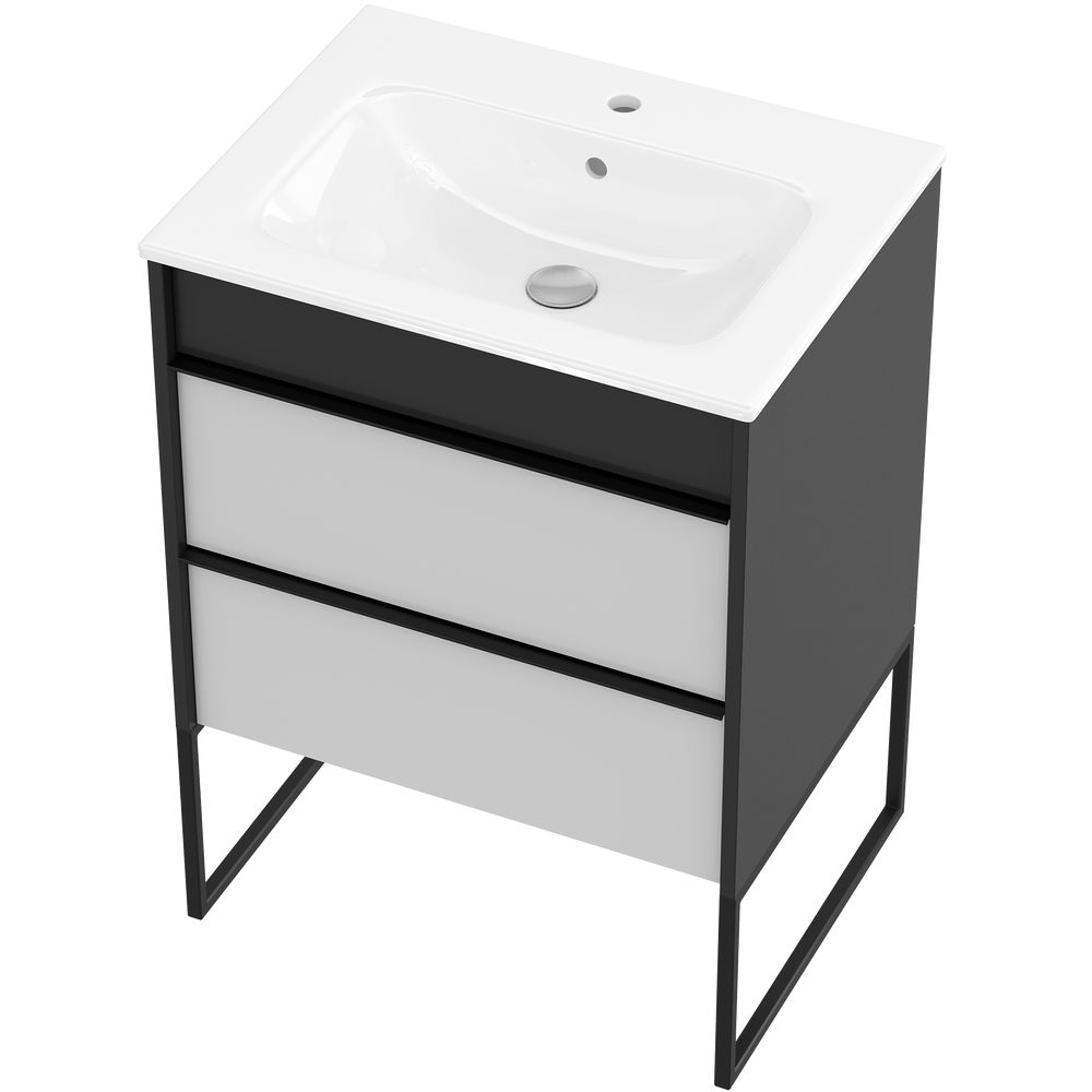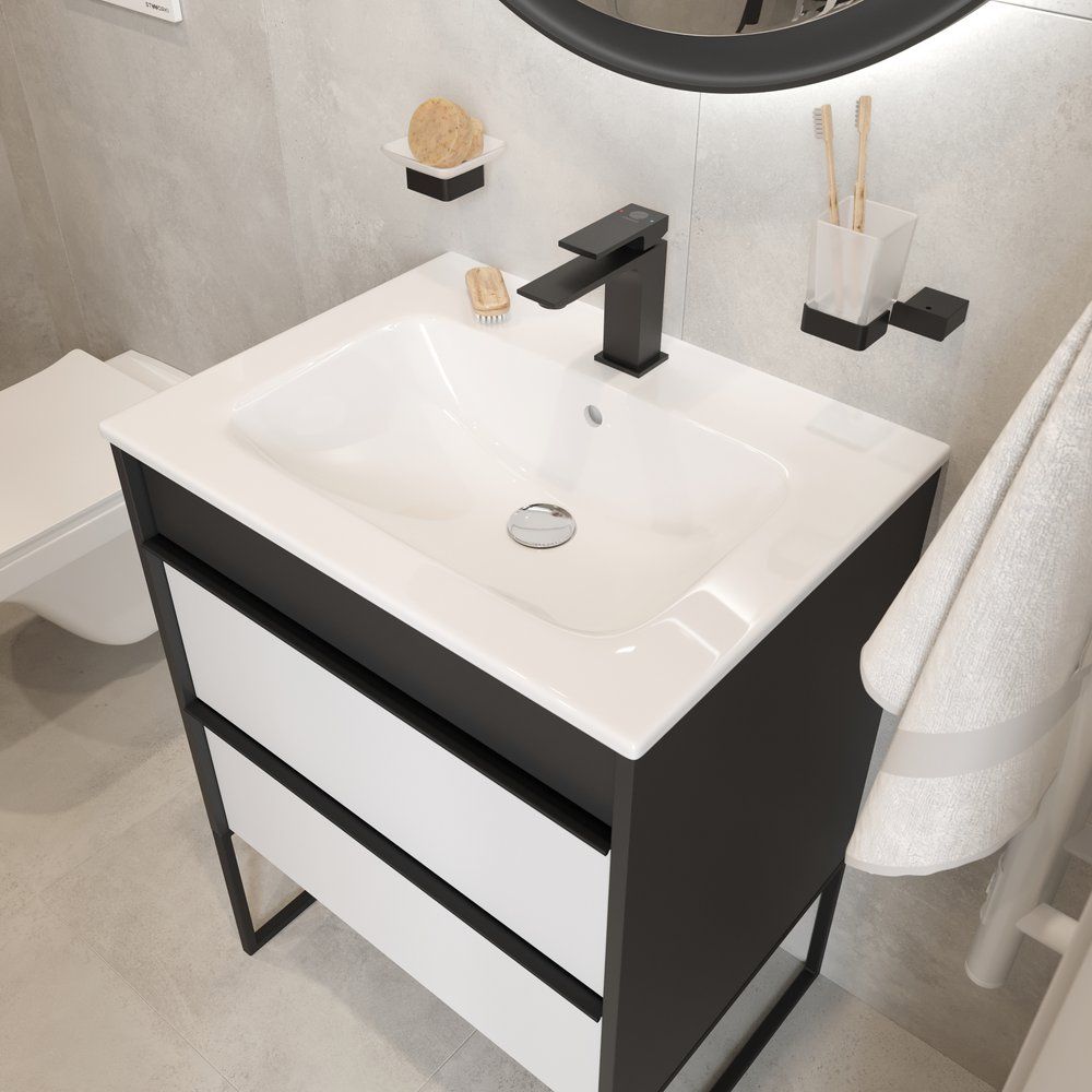 Тумба из комплекта STWORKI Гриндстед обладает следующими характеристиками: габариты 61,5x47x58 см, конструкция позволяет как напольное, так и подвесное крепление. Корпус и фасад изготовлены из ламинированного ЛДСП, обеспечивая защиту от влаги и эстетичный внешний вид. Специальный механизм доводчика гарантирует плавное закрытие ящиков, а черная фурнитура создает стильный контраст.