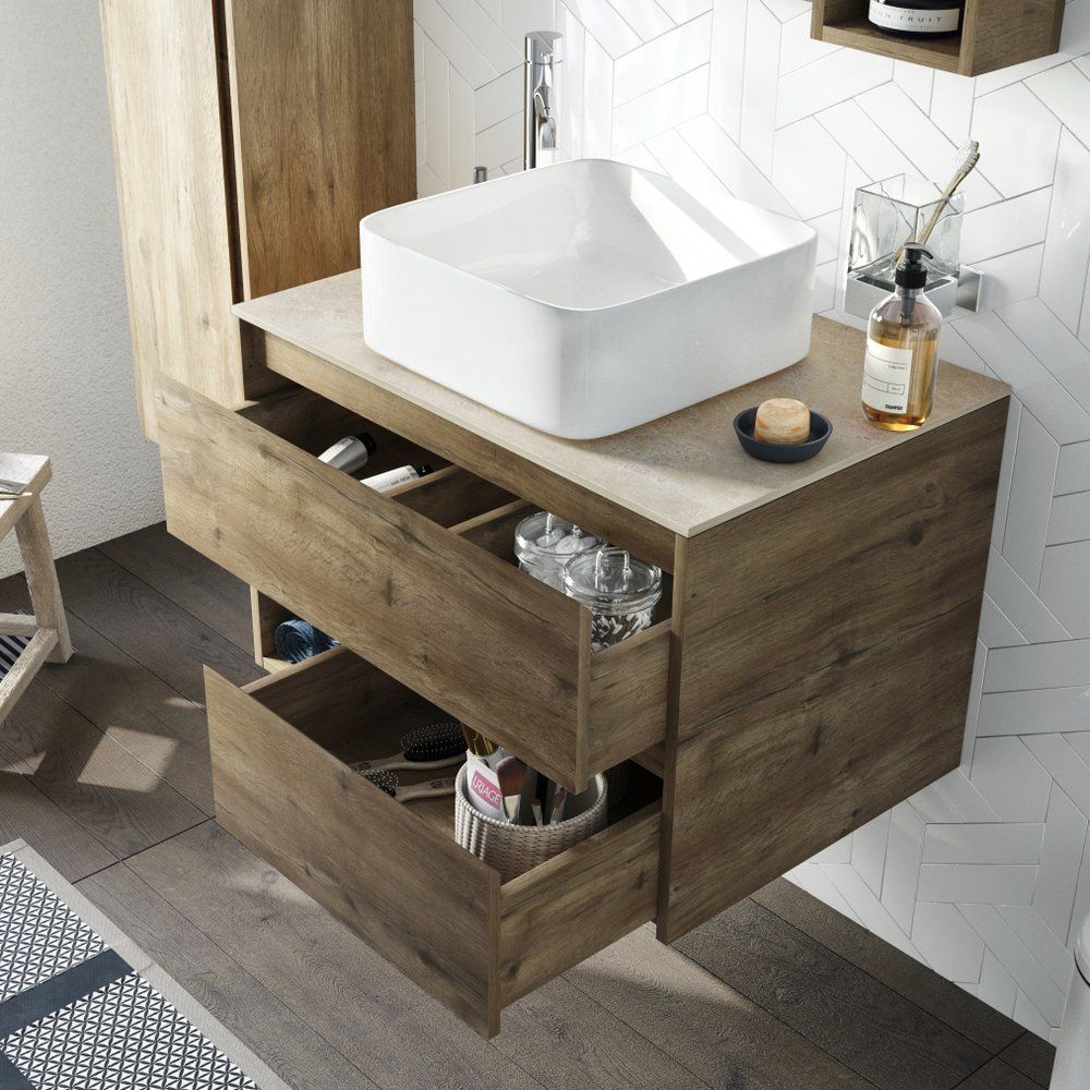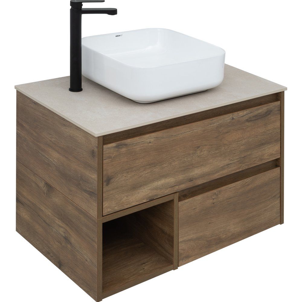 Тумба с раковиной STWORKI «Карлстад 75» в элегантном оттенке «дуб рустикальный» станет незаменимым атрибутом вашей ванной комнаты. За счет своей практичной конструкции, включающей два вместительных ящика и открытую нишу, она обеспечивает удобное хранение необходимых гигиенических принадлежностей. Чтобы защитить мебель от влажности, устанавливается столешница из прочного керамогранита с продуманными отверстиями для накладной раковины и смесителя. Функциональность и безопасность работы обеспечиваются высококлассными немецкими направляющими Hettich Quadro Silent System, а система доводчиков предотвращает громкие стуки при закрывании. Фасад с интегрированными ручками гарантирует максимальную безопасность и удобство.
