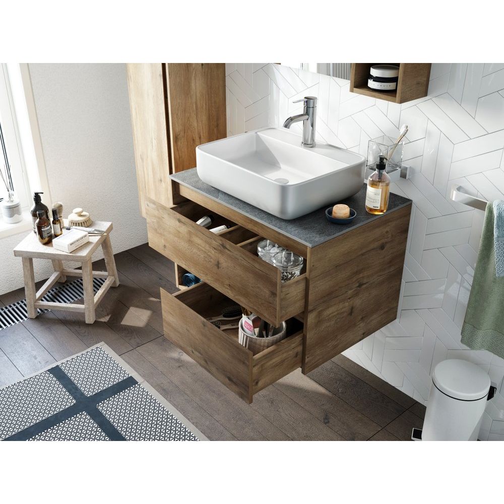 Погрузитесь в атмосферу домашнего уюта с тумбой под раковину STWORKI Карлстад 75 в благородном оттенке «дуб рустикальный». Эта стильная и функциональная мебель станет отличным решением для организации пространства в ванной комнате. С двумя вместительными ящиками и открытой нишей у вас всегда будет порядок и все необходимые вещи всегда под рукой. Поверхность из керамогранита с отверстием под раковину защищает мебель от влаги, а надежные немецкие направляющие Hettich Quadro Silent System обеспечивают плавное и бесшумное закрывание ящиков. Для дополнительной безопасности встраиваемые фасадные ручки дают максимальный комфорт в использовании.