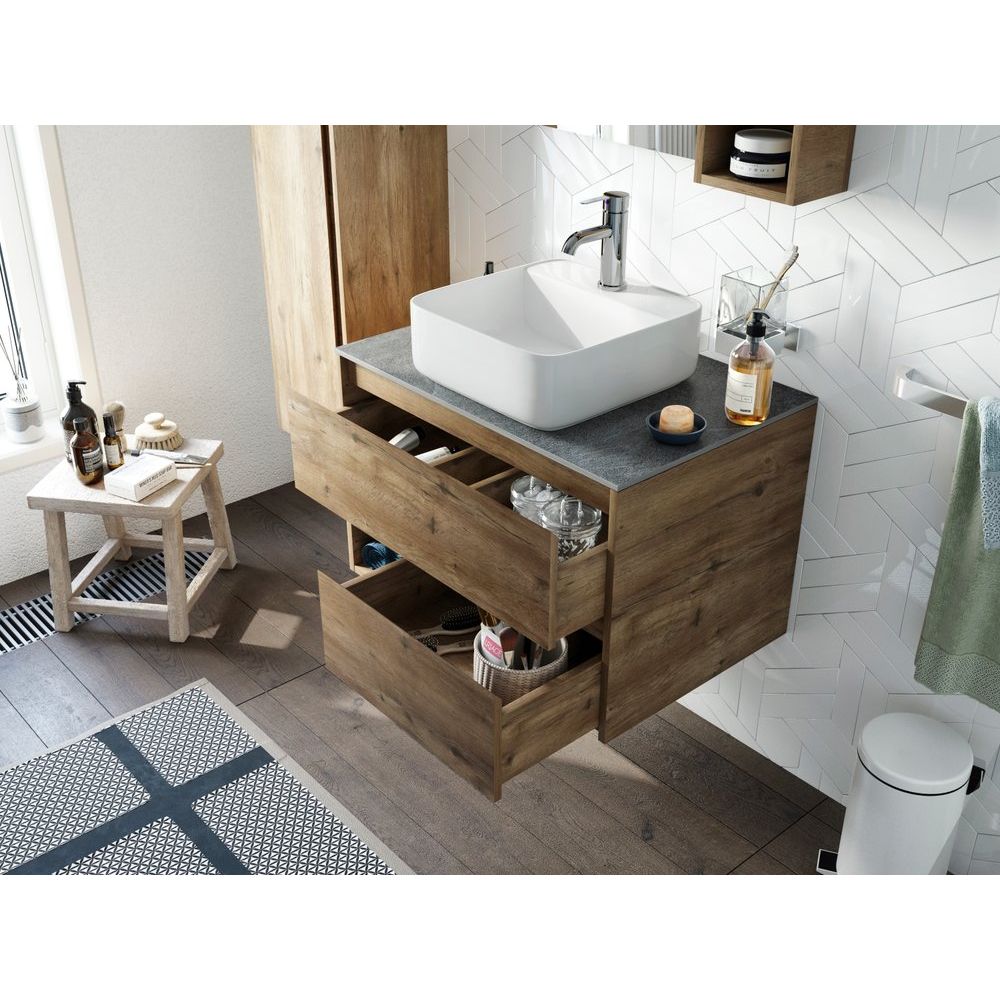 Столешница STWORKI 75 роверелла дополняет комплект, выполненная из керамогранита в сером цвете, и имеют размеры 75.6x46.5x1.1 см. Поставляется без готовых отверстий под смеситель, что позволяет выбрать оптимальное расположение.