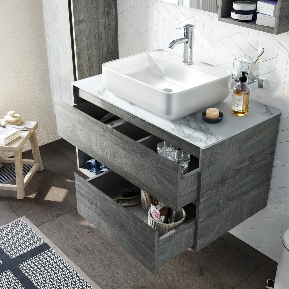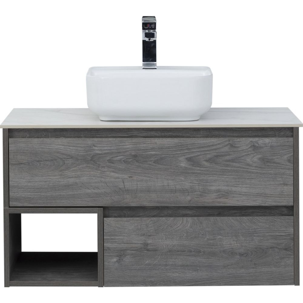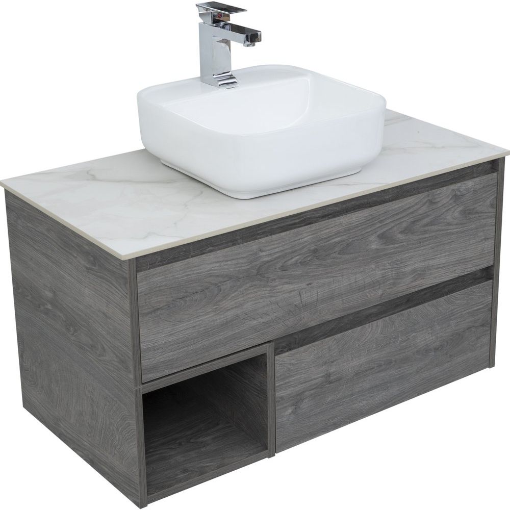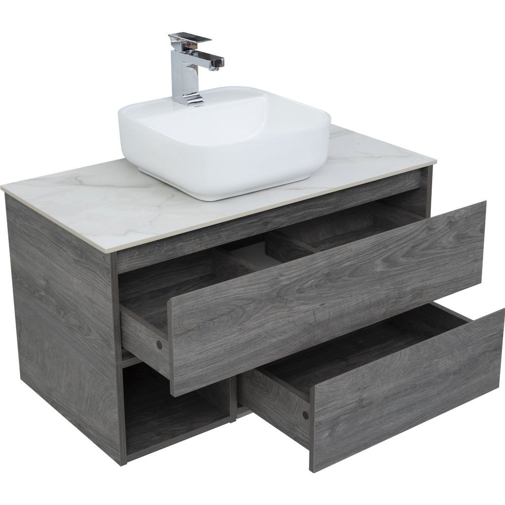 Тумба STWORKI Карлстад 90 выполнена в цвете дуб рошелье, подвесная, с размерами 88,6x46x48 см. Оснащена механизмом доводчика для плавного закрывания. Корпус и фасады покрыты ламинатом, толщина корпуса составляет примерно 17 мм, фасада — 20 мм. Имеет ящики и открытые полки. Гарантия на изделие действует 2 года. Столешница STWORKI 90 монте тиберио размером 90.6x46.5x1.1 см, изготовлена из белого керамогранита и поставляется без намеченных отверстий под смеситель. Раковина STWORKI City 2 из фарфора размерами 39x39 см снабжена одним готовым отверстием под смеситель, подходит для сифона диаметром 3.2 см, гарантия 5 лет.