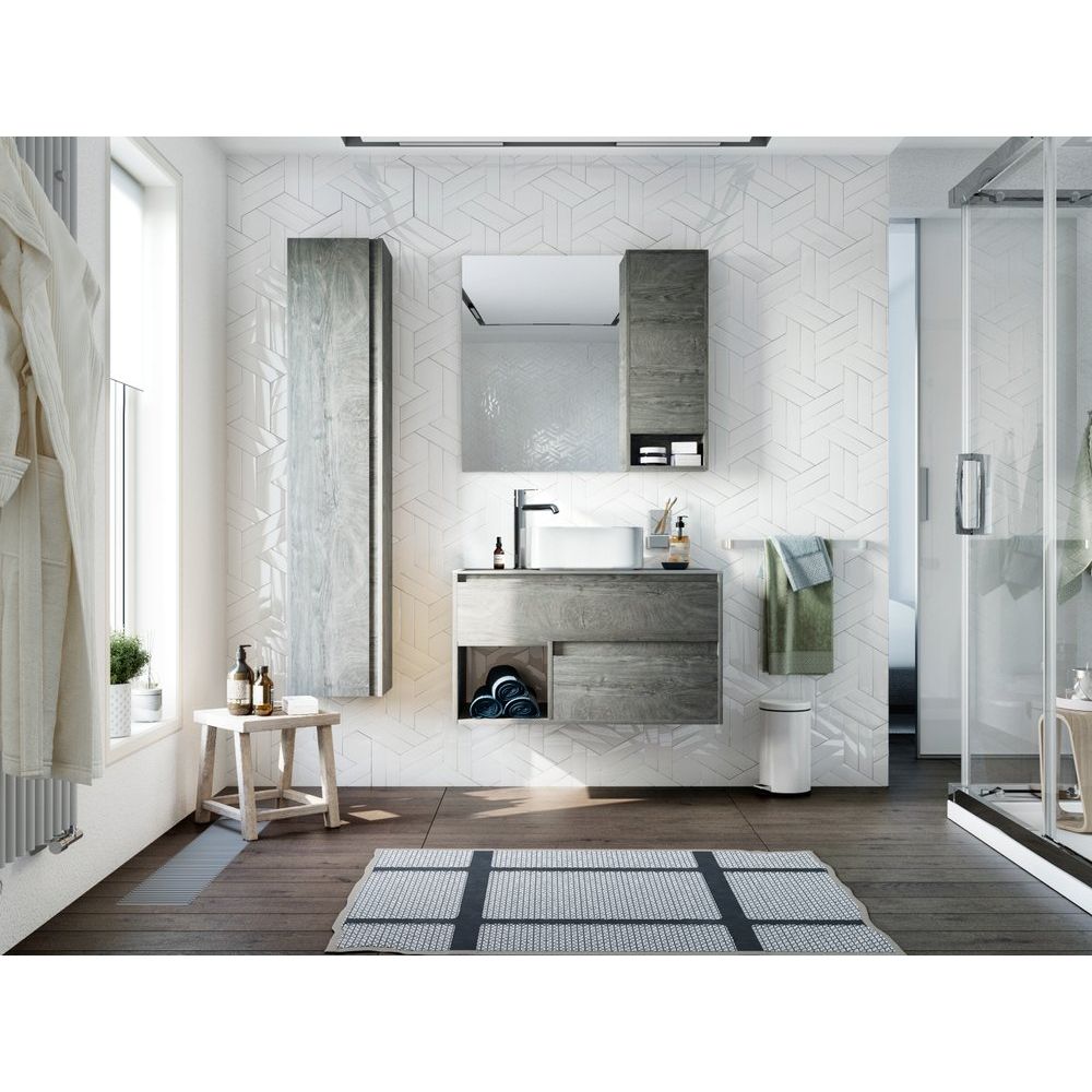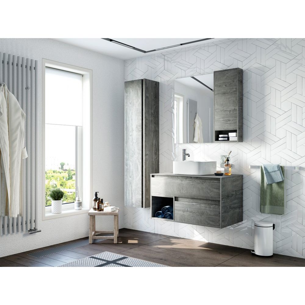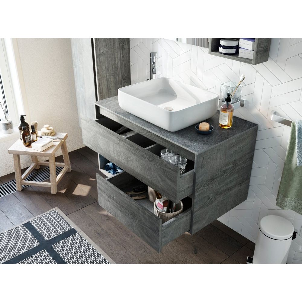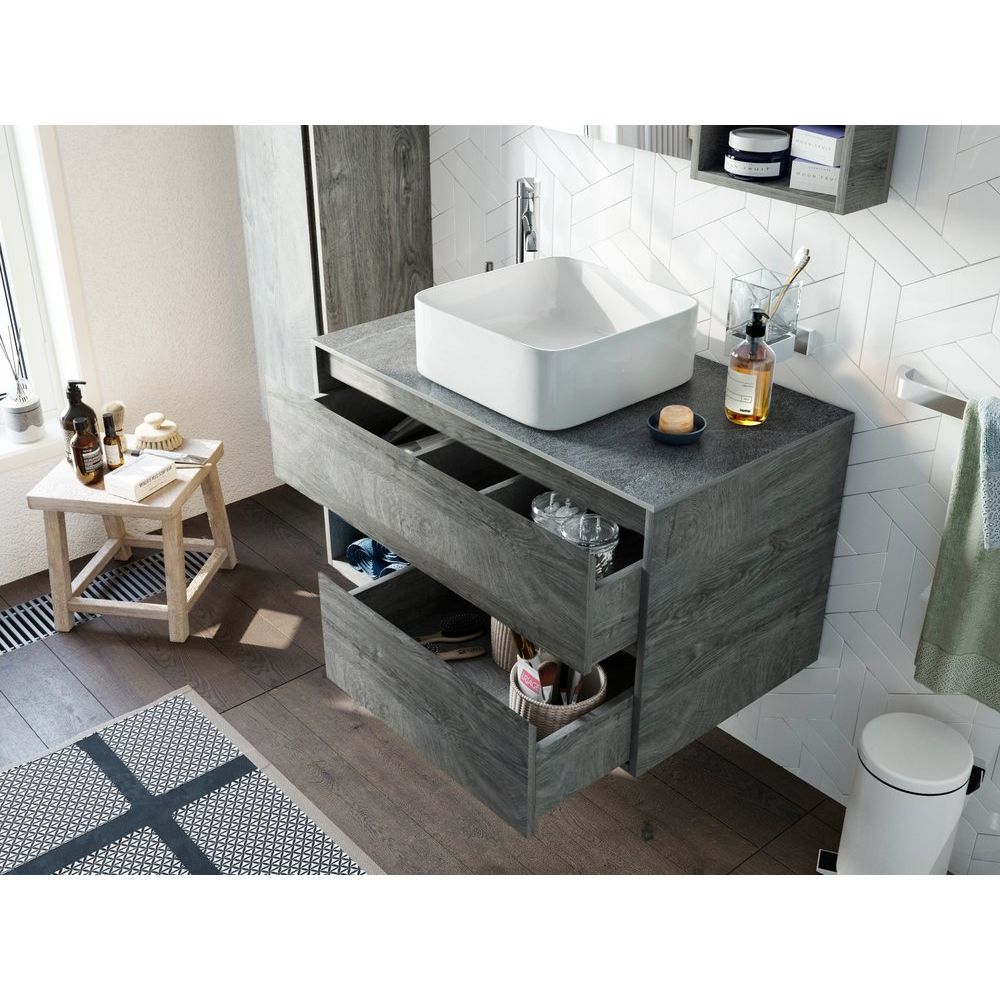 Тумба STWORKI Карлстад 90 обладает размерами 88,6x46x48 см и подвешивается к стене, что делает её лёгкой в установке и эксплуатации. Конструкция включает плавно закрывающиеся ящики, выполненные из ламинированного ЛДСП, с примерной толщиной 17 мм для корпуса и 20 мм для фасада. Покрытие корпуса и фасада выполнено из ламината, что дополнительно защищает от влаги и создает целостный образ. Столешница выполнена из серого керамогранита размером 90.6x46.5x1.1 см и содержит готовое отверстие для установки смесителя. Мебельная раковина из фарфора размером 38,5x38,5 см подходит для сифона диаметром 3.2 см. На раковину дается 5-летняя гарантия, на все остальные изделия — 2 года.