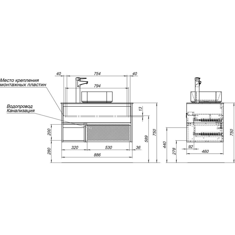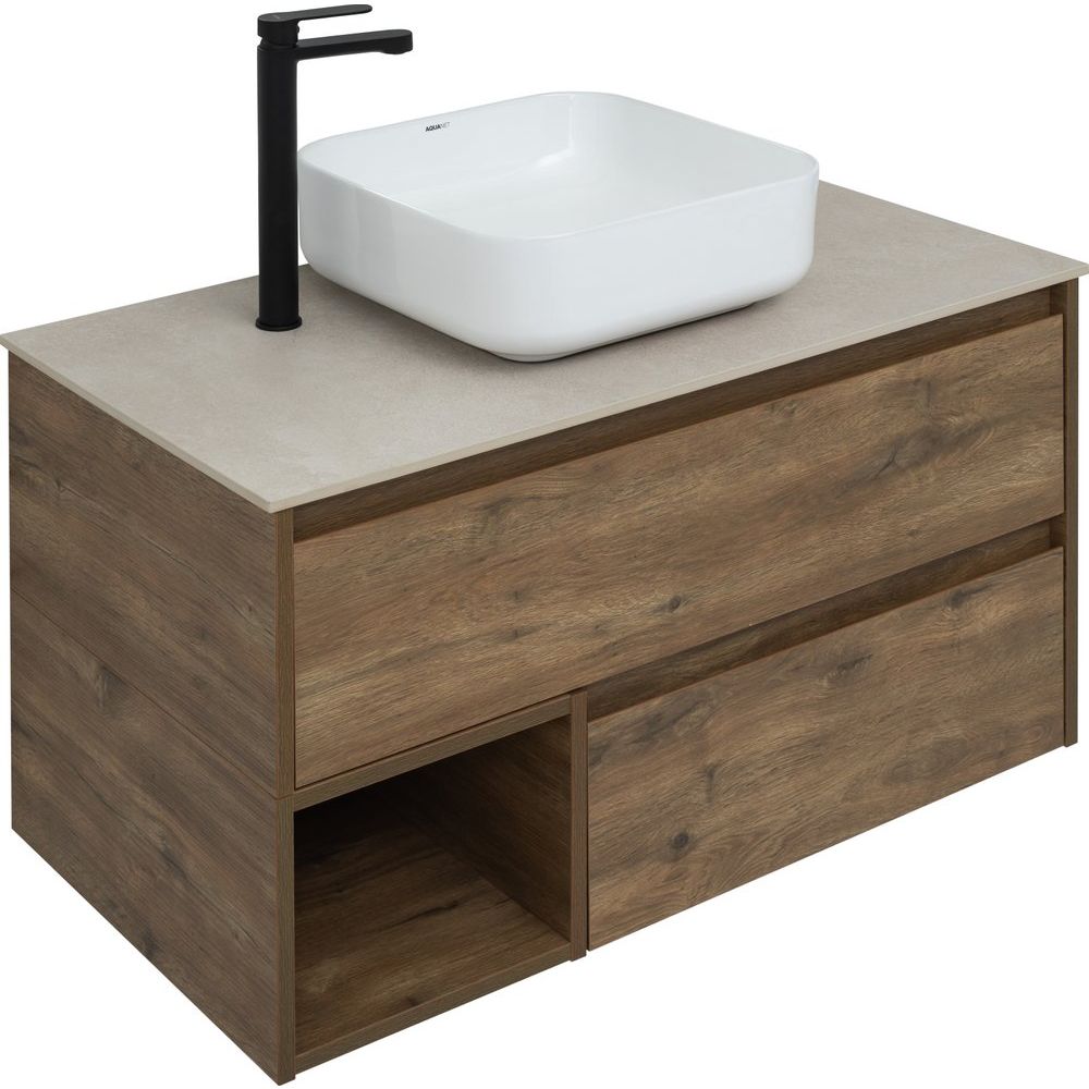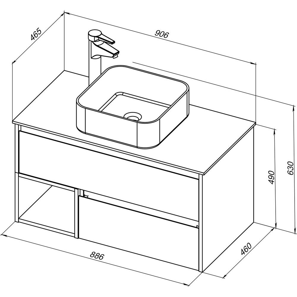 Столешница из керамогранита размером 90.6x46.5x1.1 см оснащена отверстием для смесителя. У тумбы нет намеченных отверстий под установку других элементов, что предоставляет возможность гибкой настройки под ваши предпочтения.