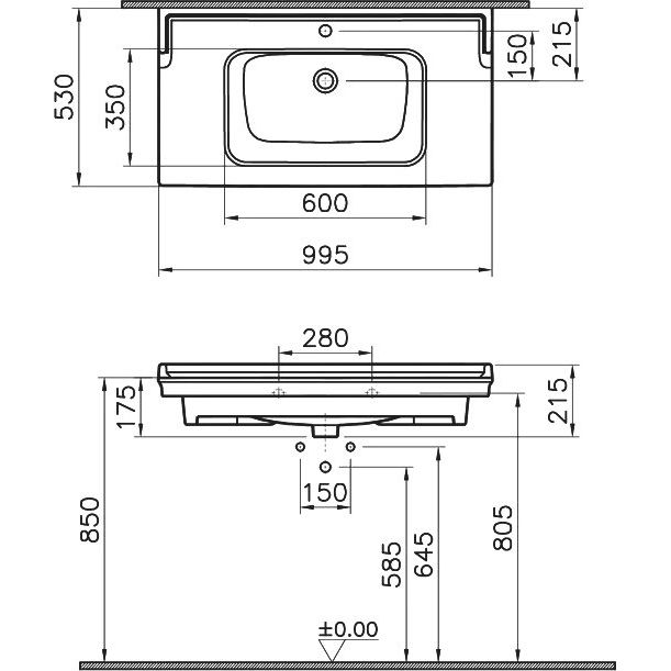 - Раковина: Габариты 99,5x53 см. Сделана из прочного фарфора. Имеется встроенный слив-перелив и отверстие под смеситель диаметром 3.2 см. Производство Турция, гарантия — 10 лет.