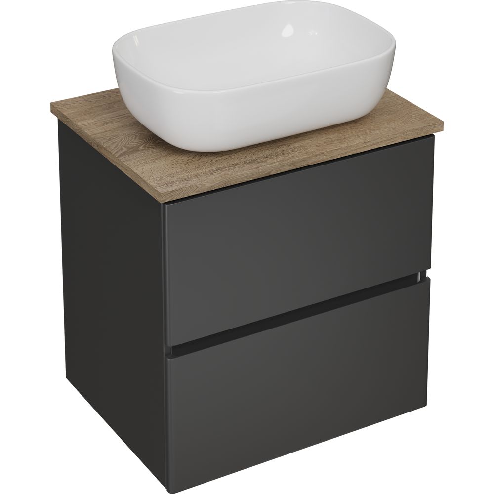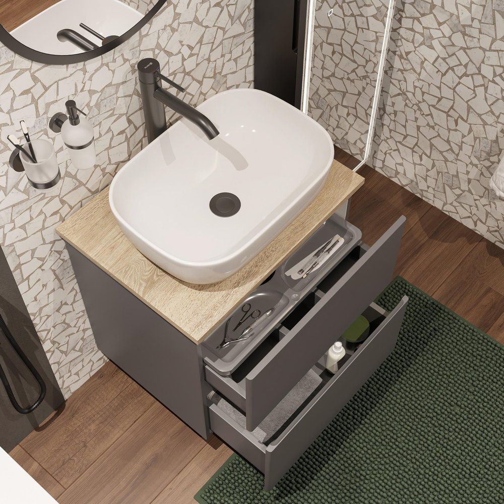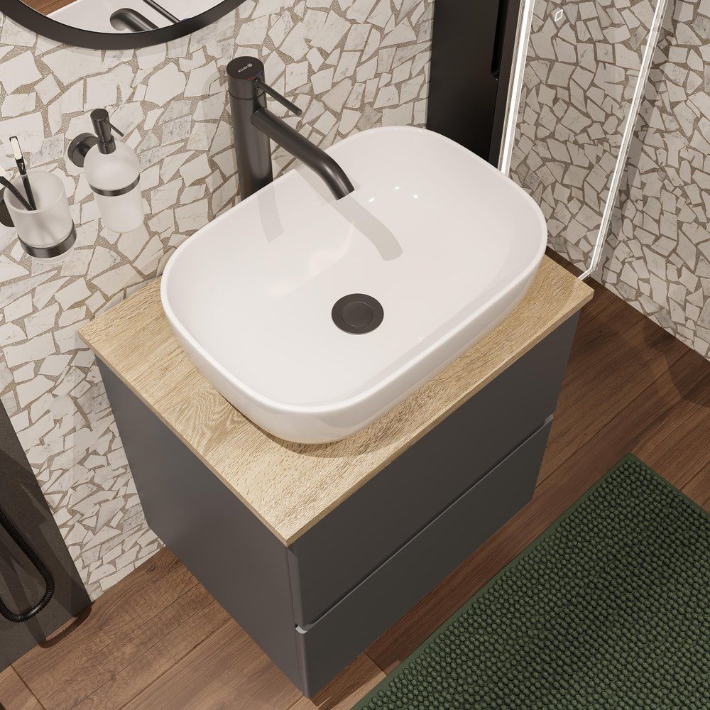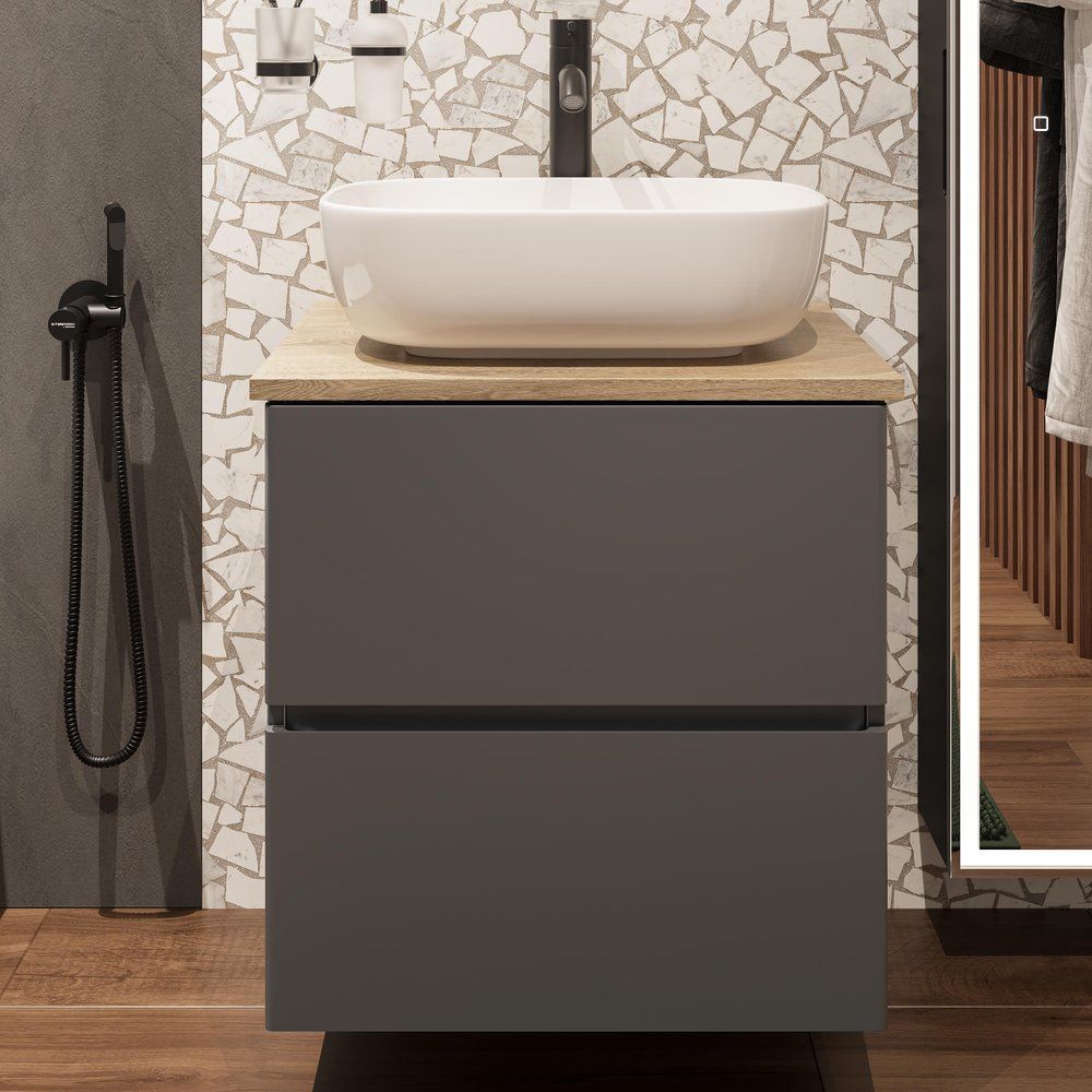 Тумба с раковиной STWORKI Колдинг 60 антрацит — это стильное и современное решение для вашей ванной комнаты. Уникальное сочетание элегантного антрацитового цвета и древесной текстуры в матовом исполнении создают атмосферу уюта и гармонии. Комплект включает в себя изысканную мебельную раковину Cersanit 50 Square и практичную столешницу из керамогранита Cersanit Wood Spirit. Благодаря подвесной конструкции и продуманному дизайну, этот набор легко впишется в любой интерьер, обеспечивая максимум функциональности при минимуме пространства.