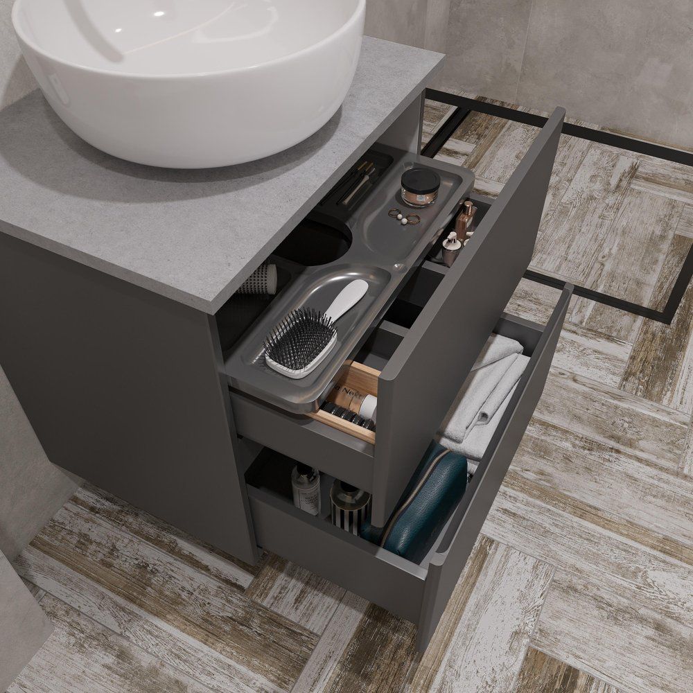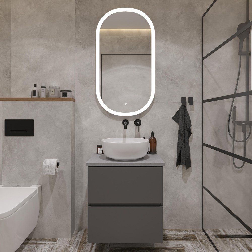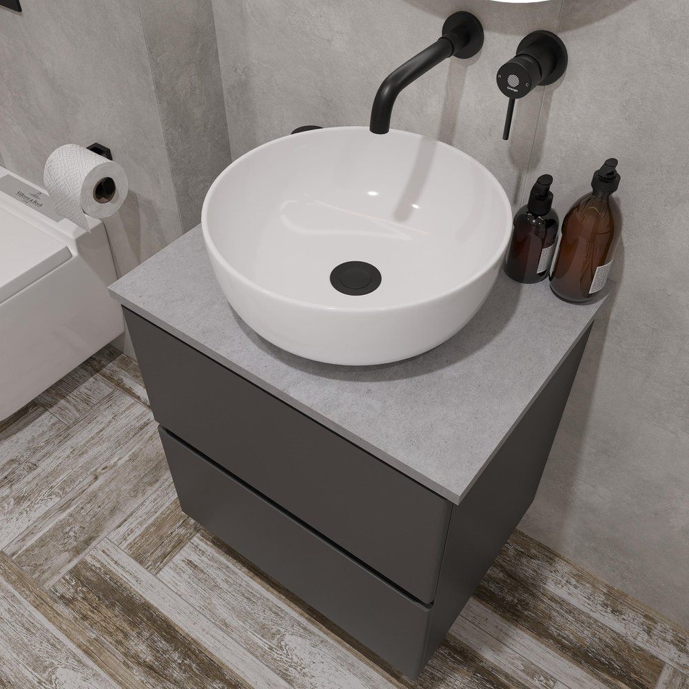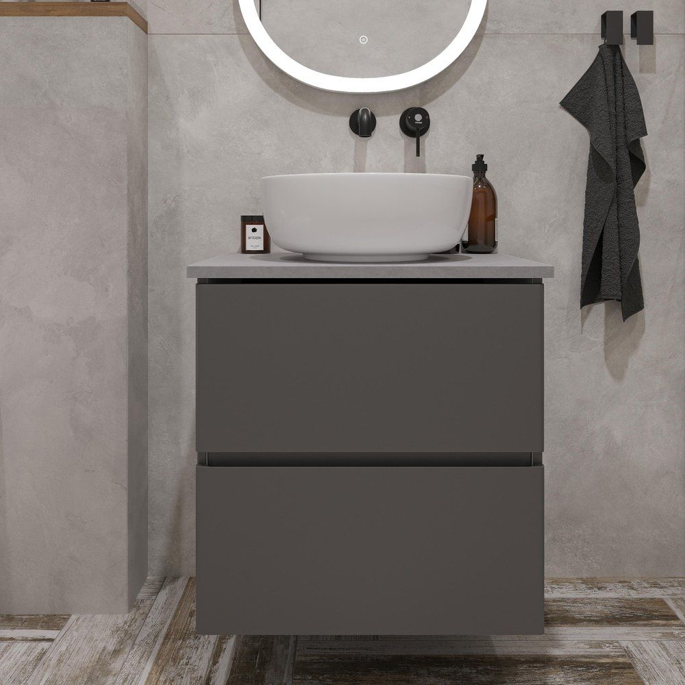 Тумба с раковиной STWORKI Колдинг 60 в изысканном оттенке антрацит — это идеальное решение для тех, кто ценит стиль и функциональность в интерьере ванной комнаты. Этот комплект объединяет в себе тумбу, раковину и столешницу, создавая гармоничную и современную атмосферу. Отличительная черта коллекции Колдинг — подвесная конструкция, которая не только экономит пространство, но и визуально облегчает дизайн. Отделка из пленки на МДФ обеспечивает долговечность и простой уход за поверхностями. Раковина Cersanit Moduo 40 RING выполнена из фарфора, что говорит о высокой износостойкости и легкости в уходе. Столешница из керамогранита в сером матовом цвете добавляет элегантности и гармонично дополняет общую картину.