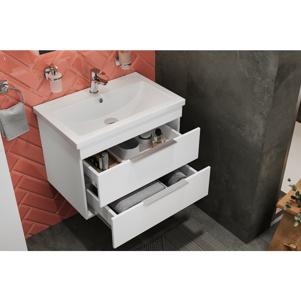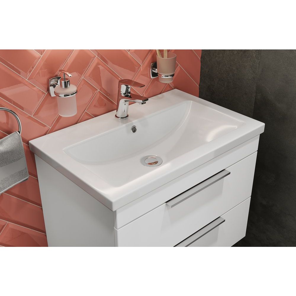 Комплектуется раковиной Cersanit Como 70 с размерами 70x45 см, сделанной из прочного фарфора и оснащенной встроенным сливом-переливом. Раковина имеет одно отверстие под смеситель и требует отдельного приобретения донного клапана, подходит для сифона диаметром 3.2 см.