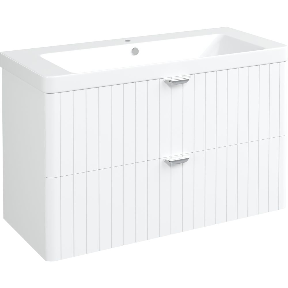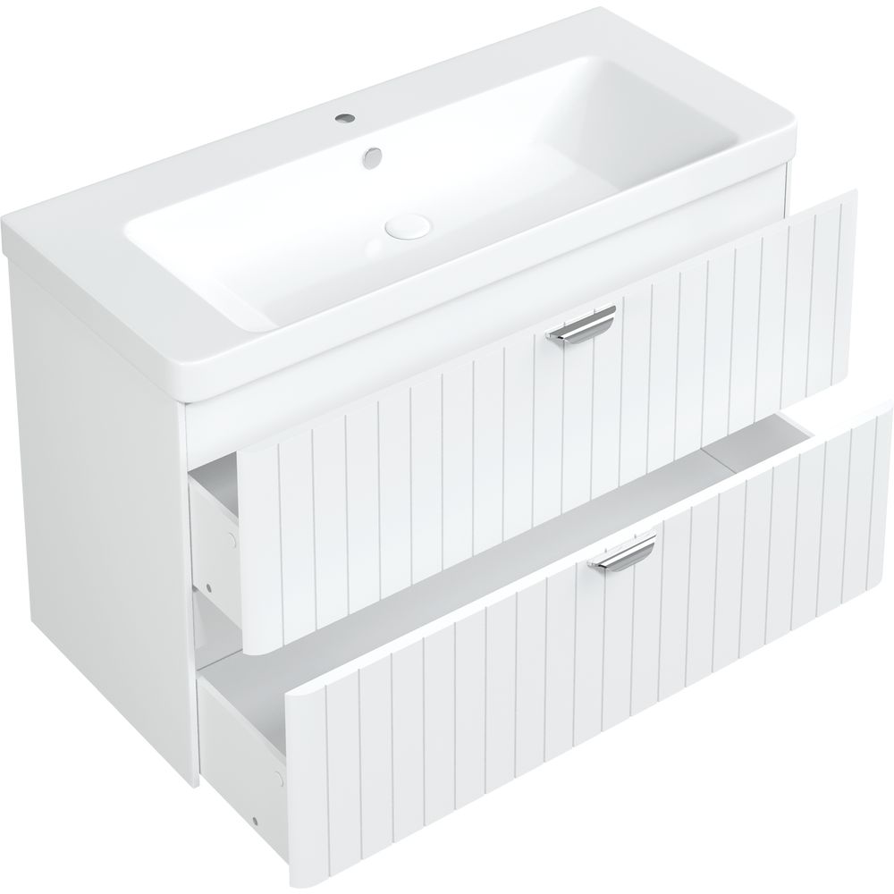 - Функциональность — подвесная конструкция и удобные ящики с механизмом доводчика для плавного закрытия.