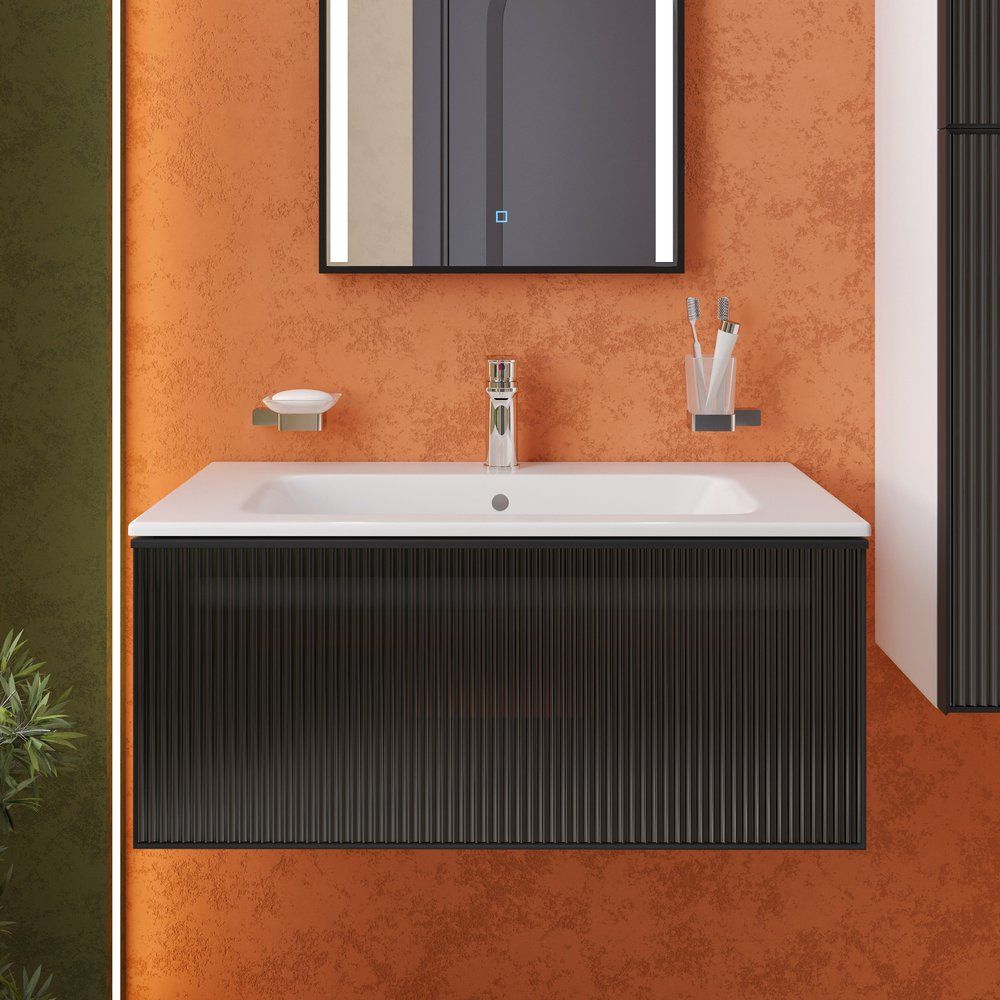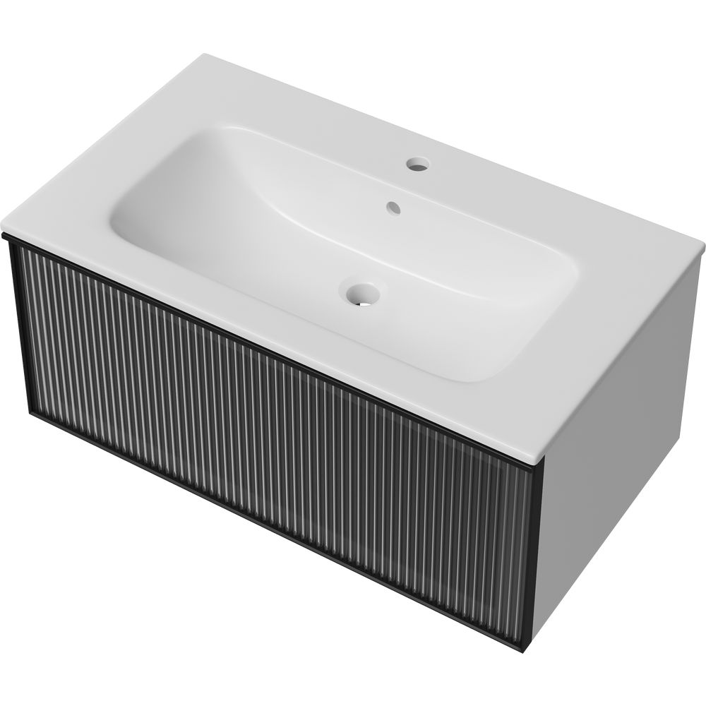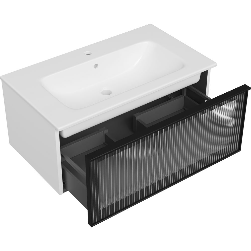 Тумба STWORKI Левангер 80 обладает габаритами 81x46x36 см и может быть установлена подвесным способом. Продуманное оснащение тумбы включает ящики с механизмом доводчика для мягкого закрывания и подсветку для улучшенного обзора содержимого. Изготовленная из надежного МДФ с эмалированным покрытием, а также металлическим фасадом, покрытым стеклом, она предвещает долговечность эксплуатации.