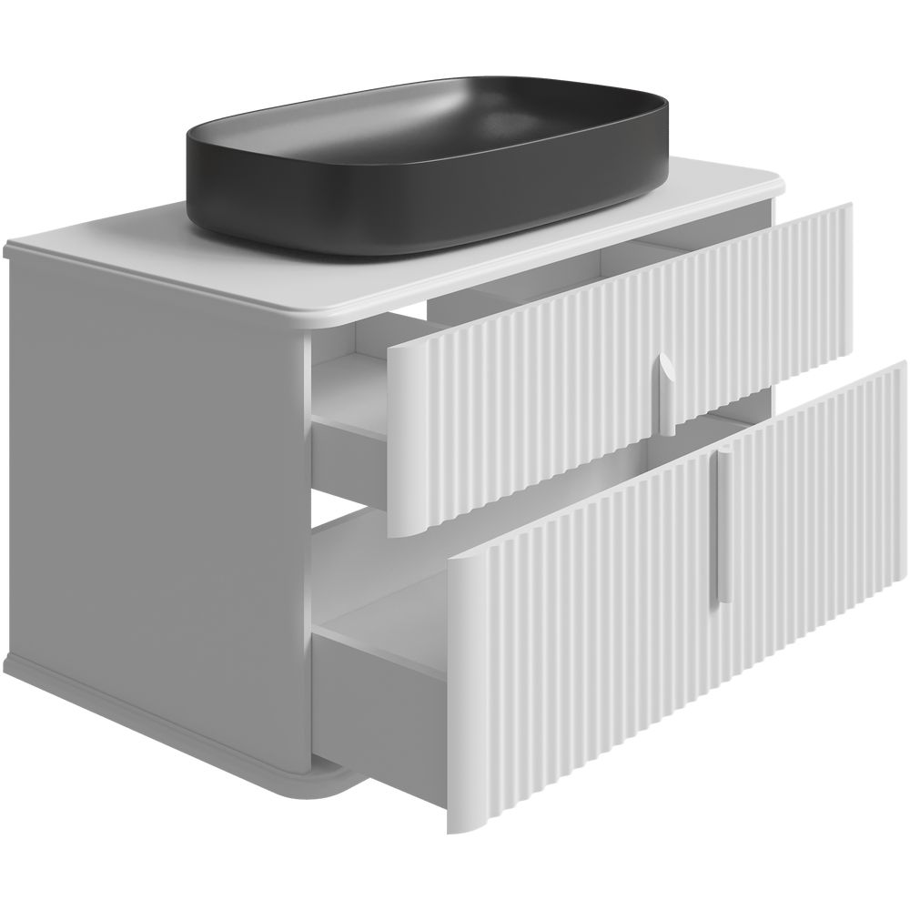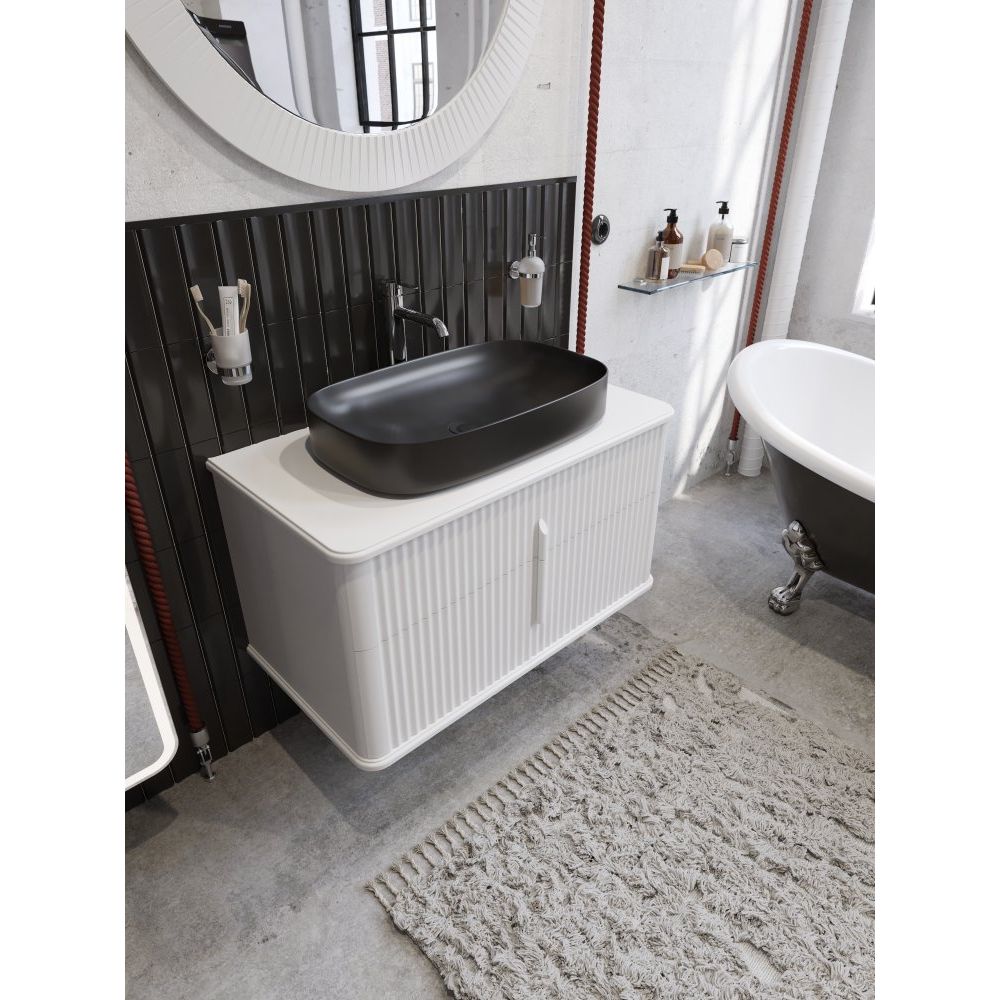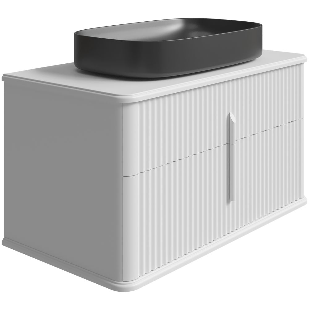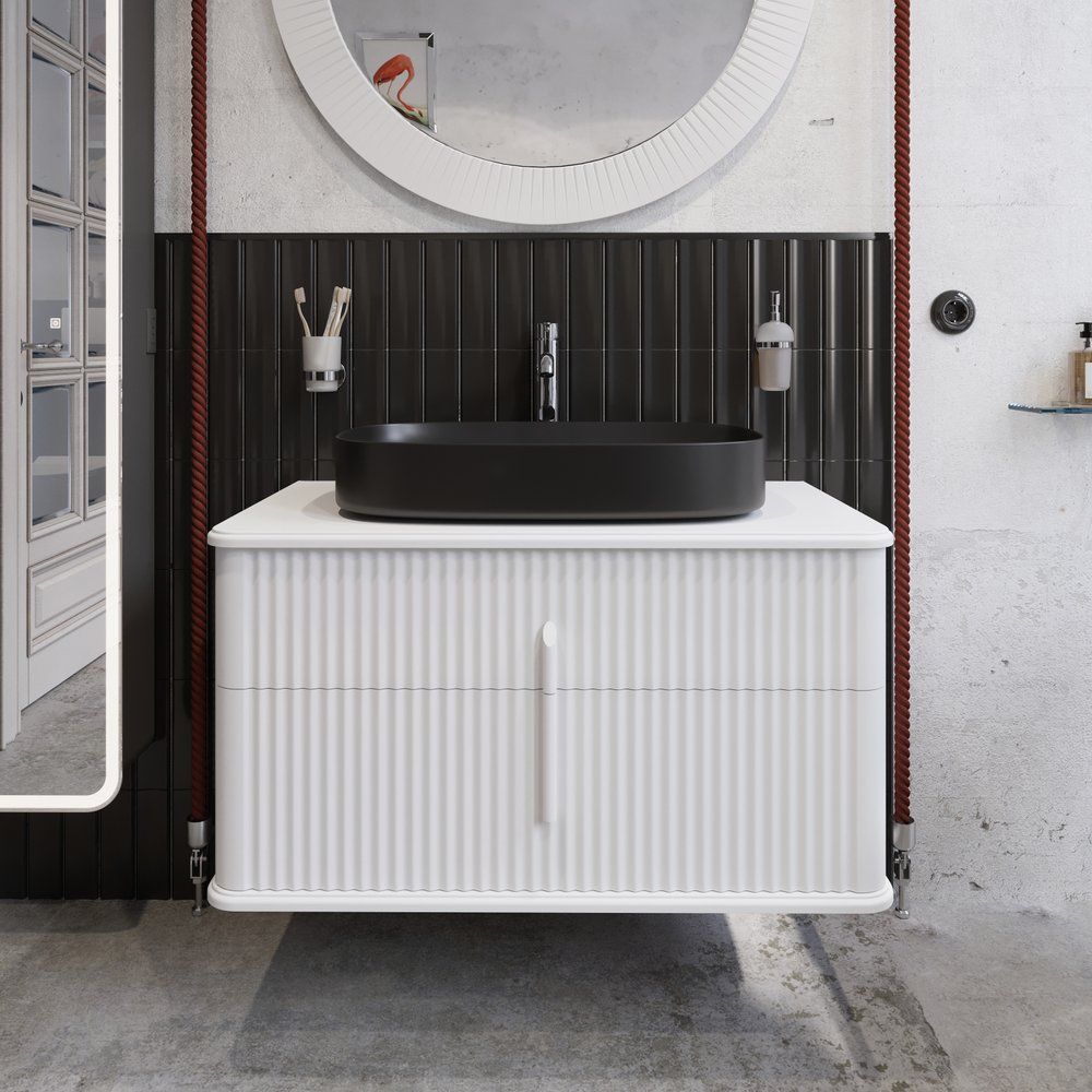 Тумба для комплекта STWORKI Молде 95 белая — подвесная конструкция размером 92,2x49,8x48 см, укомплектованная механизмами, обеспечивающими плавное закрывание. Изготовлена из МДФ с пленочным покрытием. Раковина STWORKI накладная по размерам 65x40 см выполнена из фаянса и требует отдельного приобретения донного клапана. Столешница из МДФ имеет готовое отверстие под смеситель и аккуратные размеры 94,8x49,8x1,9 см. Комплект дополняет сифоном с мокрым затвором французского производства, обеспечивающим предотвращение запахов и регулируемым по высоте при установке.
