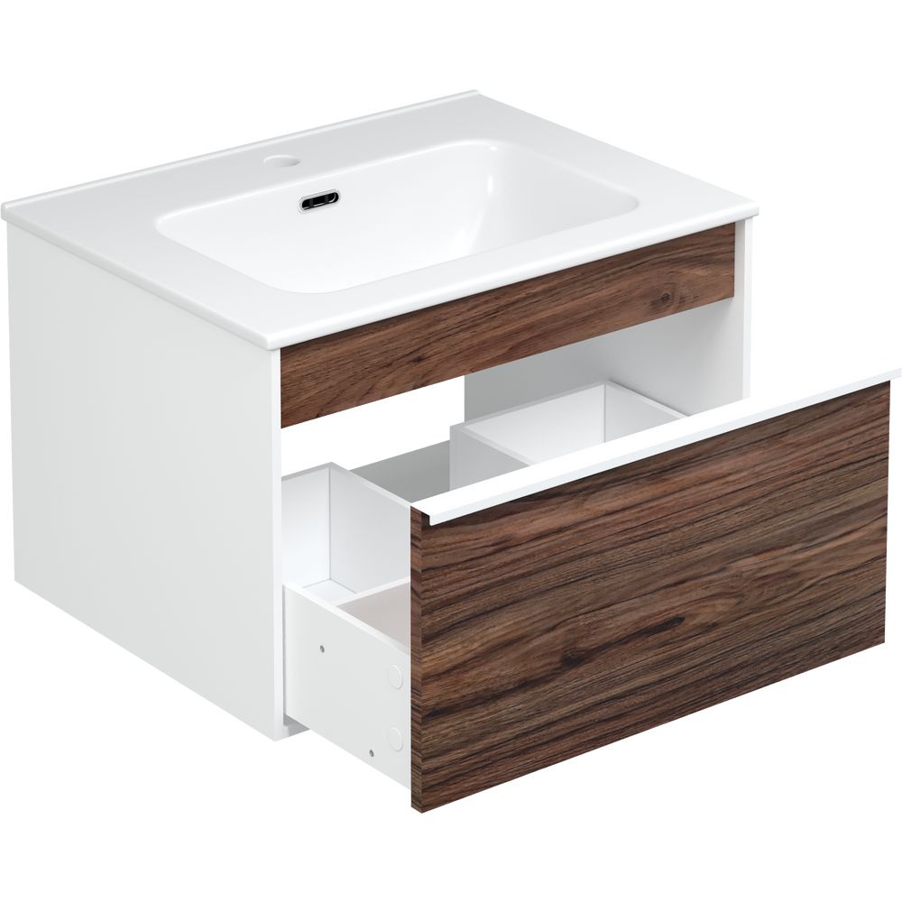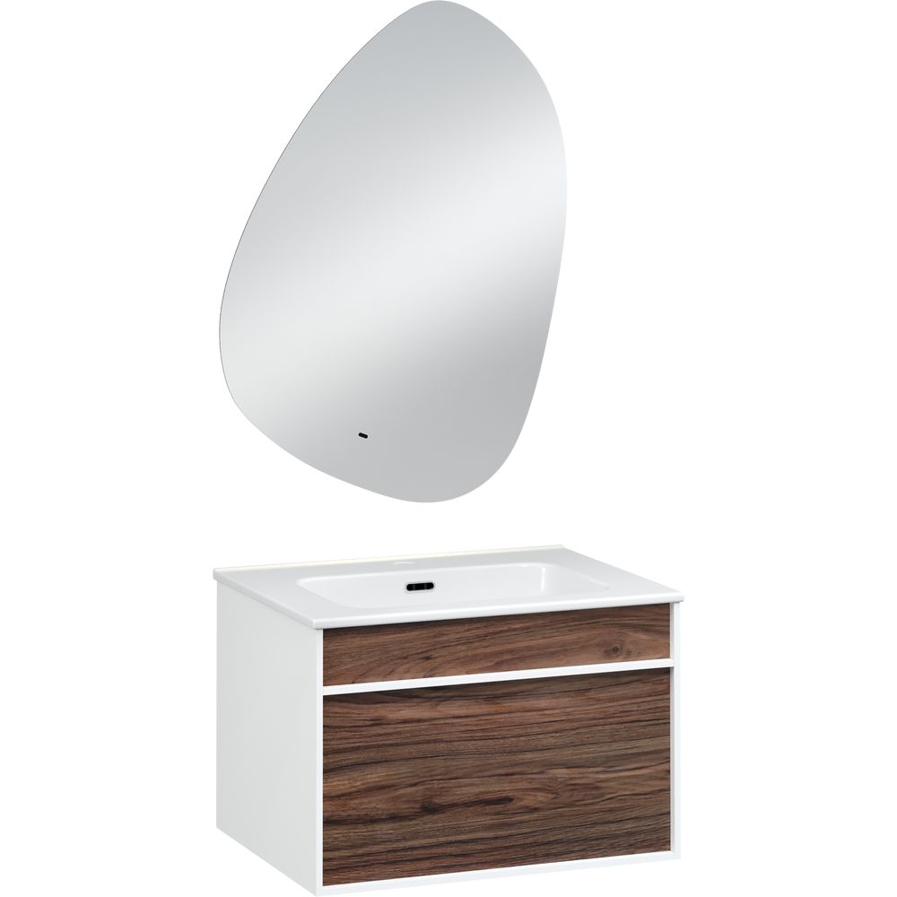 Комплект включает в себя тумбу и раковину, предлагая единое решение для ванной комнаты. Габариты тумбы — 59,7 см в ширину, 45,8 см в глубину и 39,2 см в высоту, с подвесной конструкцией, что позволяет легко поддерживать чистоту пола. Корпус выполнен из ЛДСП с эмалевым покрытием, а фасад из МДФ, отделанный пленкой, создает гармоничный внешний вид.