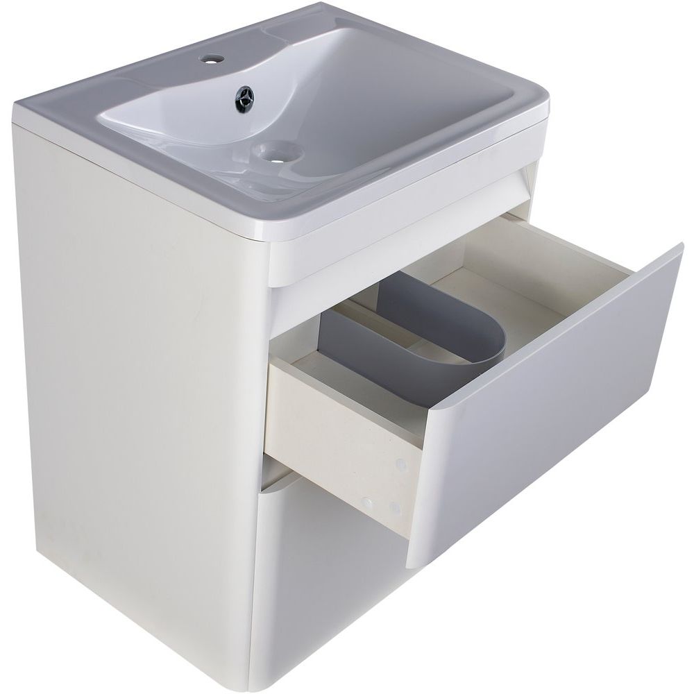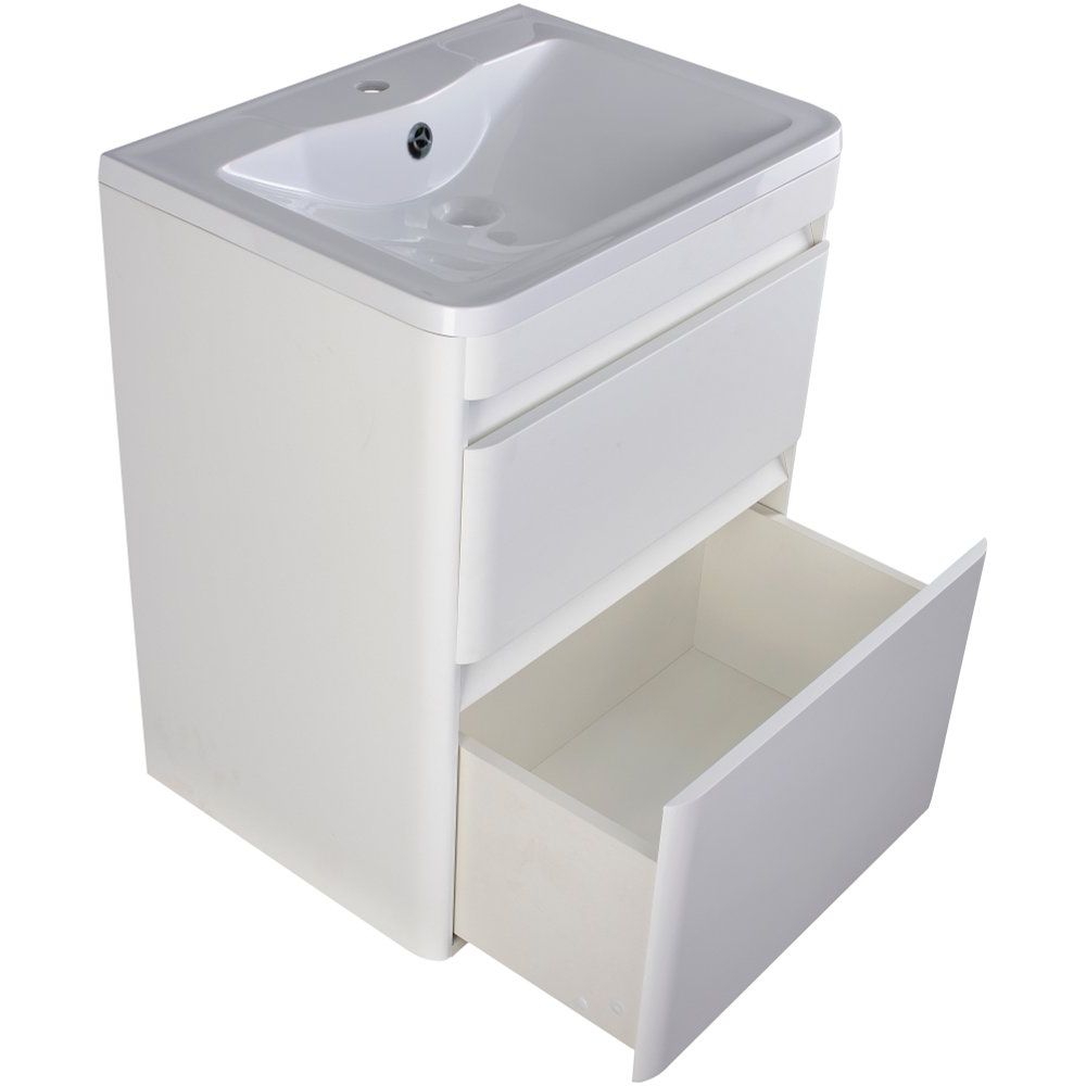 Тумба из коллекции Атлантика 60 Люкс Plus имеет размеры 60x45x82,5 см и оснащена механизмом доводчика для плавного закрывания. Корпус и фасад тумбы выполнены из МДФ с пленочным покрытием, обеспечивающим защиту и долговечность. В комплект входит раковина из искусственного мрамора размерами 60x45 см, с отверстием для смесителя и сливом-переливом с арматурой. Раковина не поддерживает установку донного клапана и требует сифона диаметром 4 см.