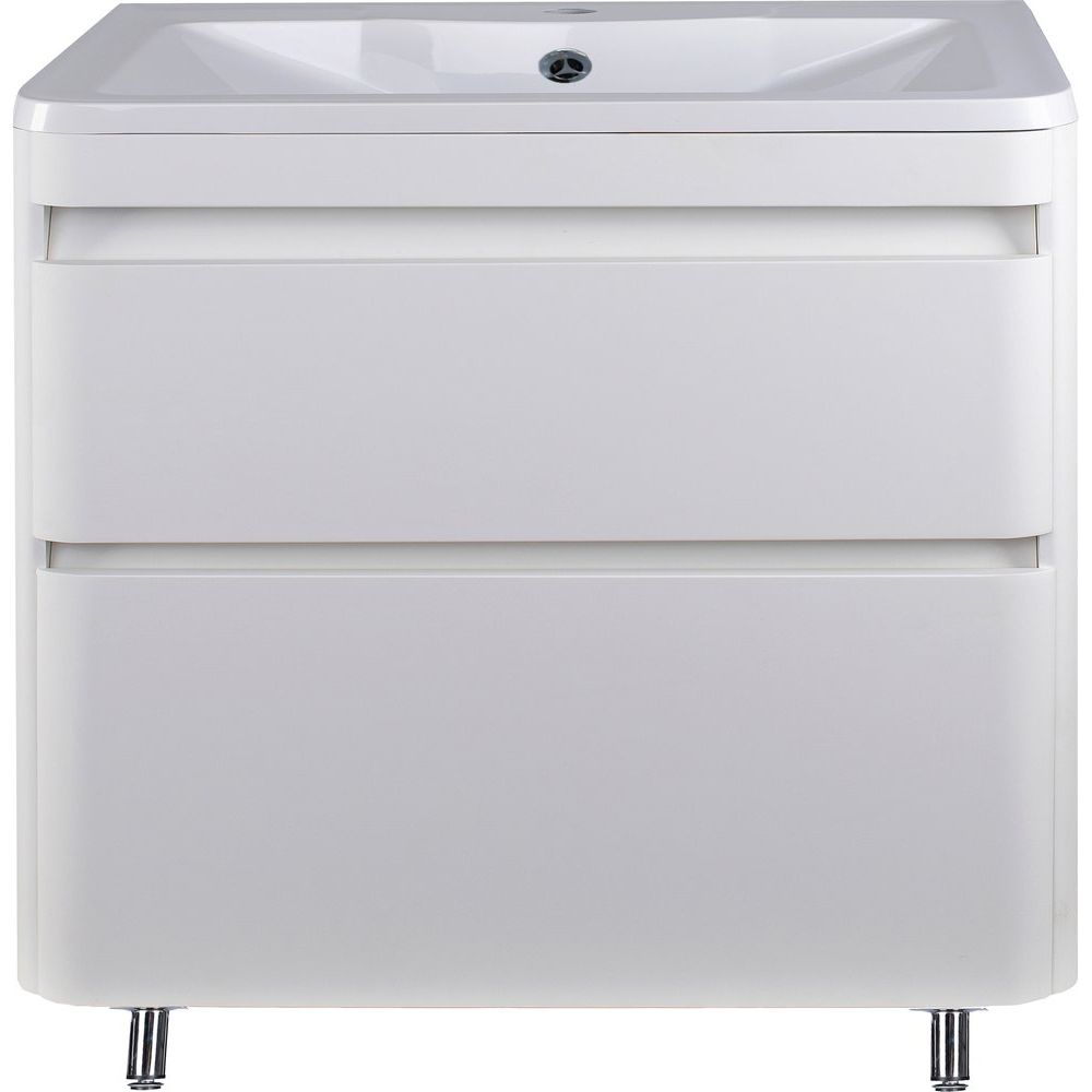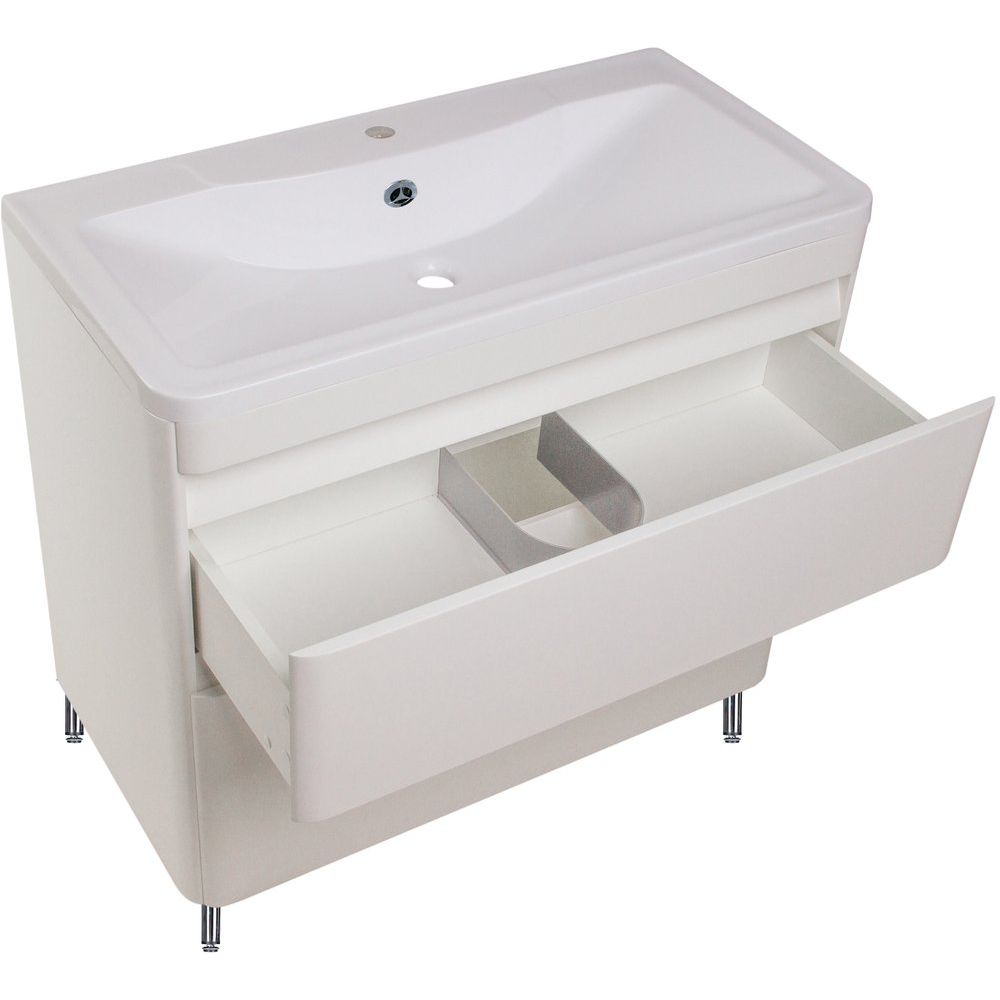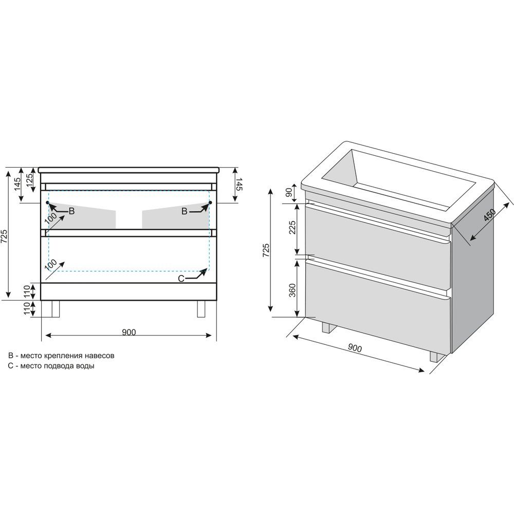 Тумба с габаритами 90x45x82,5 см выполнена с использованием МДФ и покрыта пленкой, что обеспечивает её долговечность и устойчивость к влаге. Оборудована ящиками с механизмом доводчика для плавного и бесшумного закрывания. Раковина из искусственного мрамора имеет размеры 90x45 см и укомплектована слив-переливной арматурой. Установка донного клапана не предусмотрена, но предусматривает стандартное отверстие под смеситель. Гарантия на тумбу — 1 год, на раковину — 5 лет.