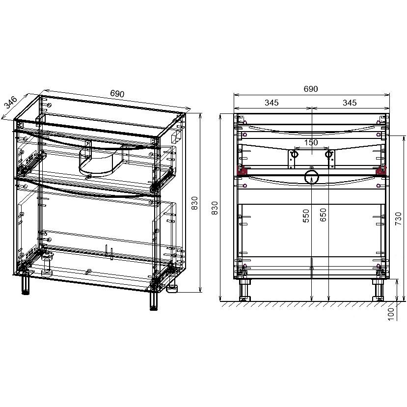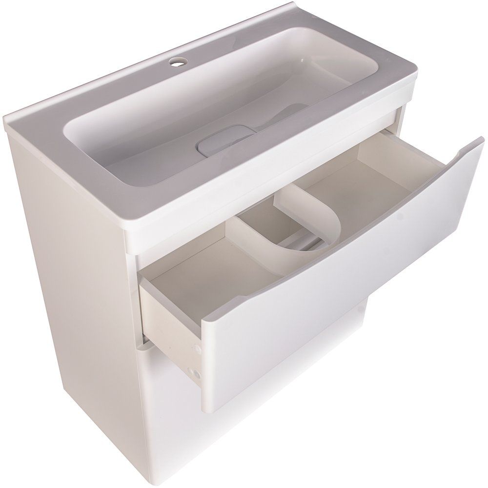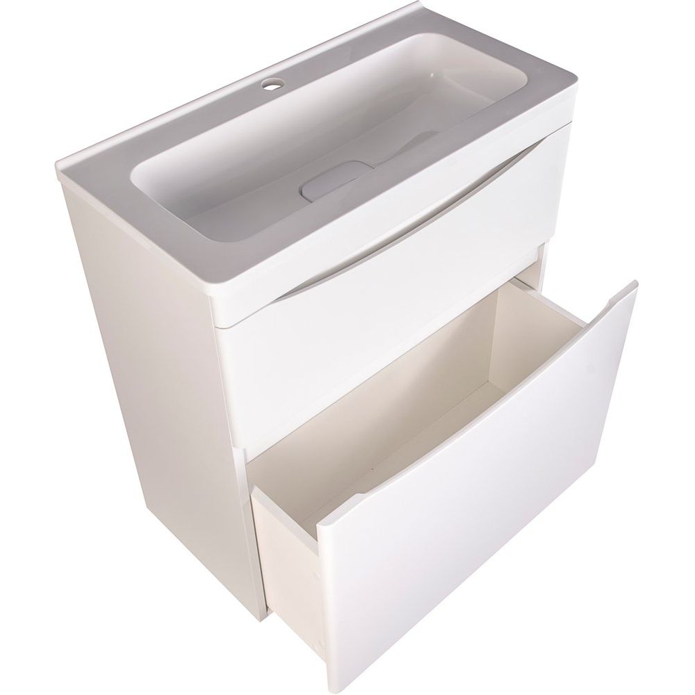 Изделие состоит из напольной тумбы размеров 69x34,6x83 см с антискрейтч покрытием. Ящики оснащены механизмом доводчика и опорными ножками. Материалы корпуса и фасада - МДФ с покрытием пленкой. Мебельная раковина размером 70x35 см выполнена из искусственного мрамора и оснащена декоративной накладкой на слив. Она имеет одно готовое отверстие под смеситель и предназначена для сифона диаметром 3.2 см.
