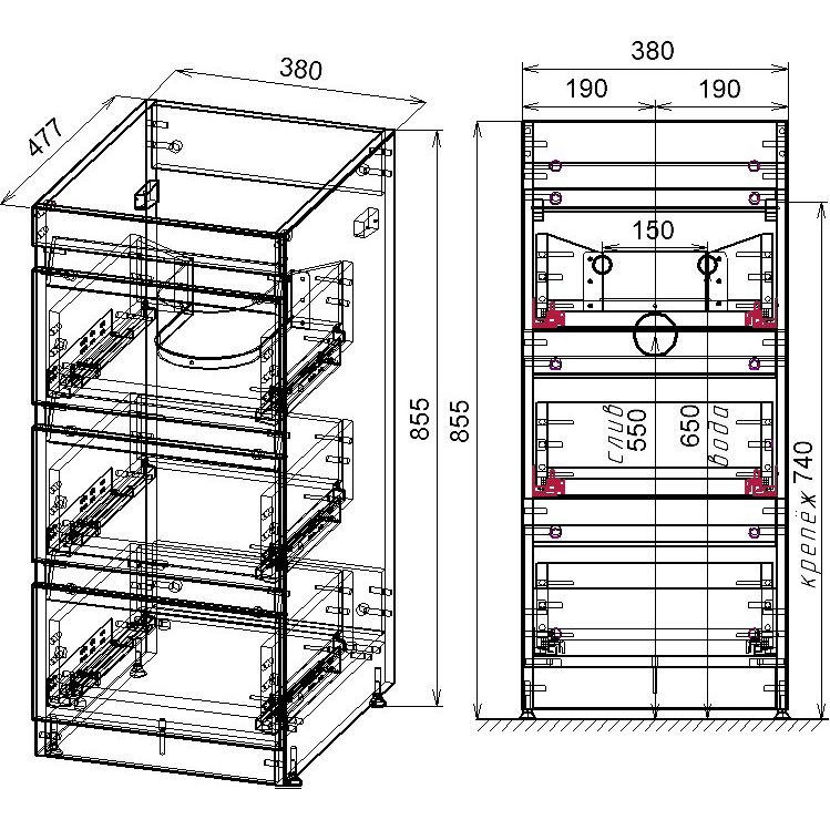 - Три вместительных ящика с системой плавного доводчика
