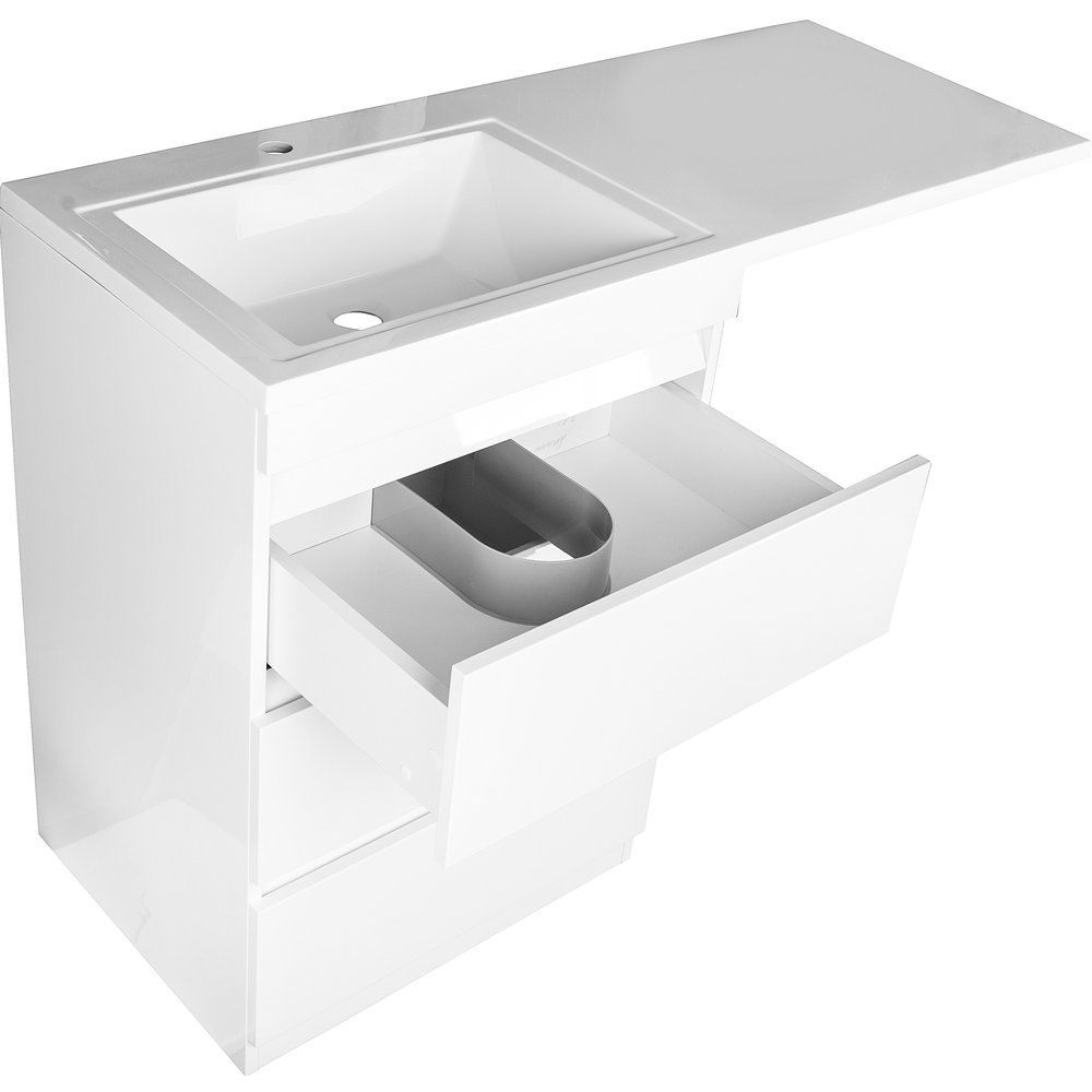 Тумба с раковиной Style Line Даллас 100 Люкс Plus – это оптимальное решение для современной ванной комнаты. Ее элегантный дизайн в сочетании с функциональностью идеально впишется в любой интерьер. Белоснежная отделка добавляет воздушности и визуальной лёгкости, что особенно актуально для небольших помещений. Прочный материал и продуманные конструкционные решения делают эту мебель долговечной и удобной в использовании. Особое внимание уделено эргономике: три вместительных ящика с механизмом плавного доводчика облегчают доступ к необходимым вещам, поддерживая порядок в ванной.
