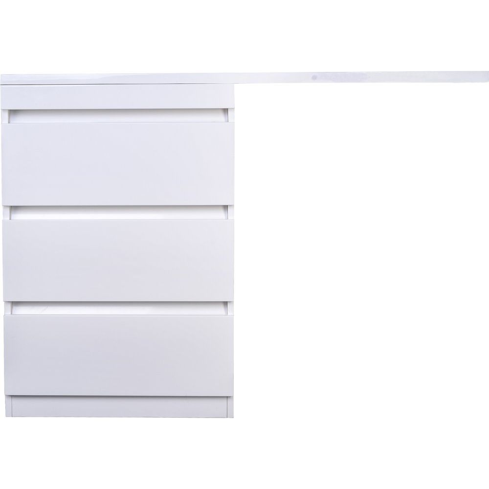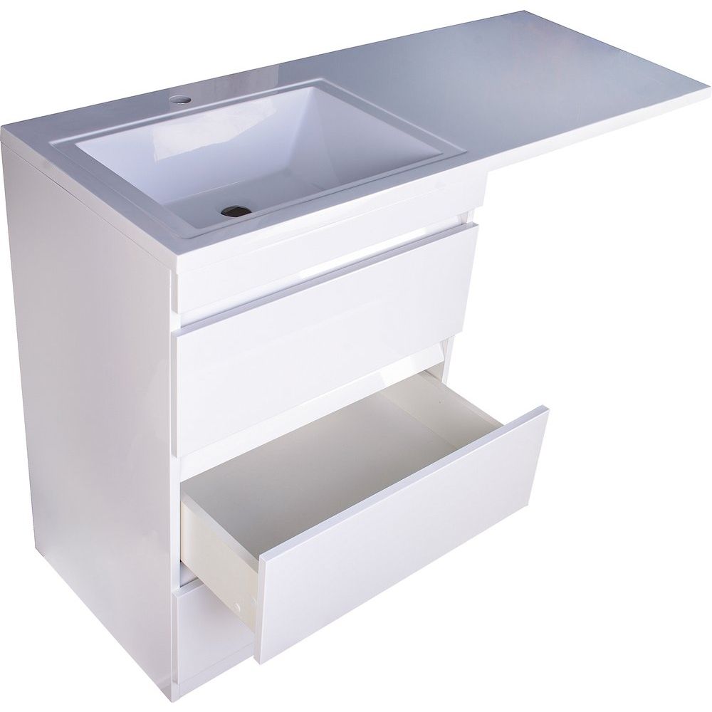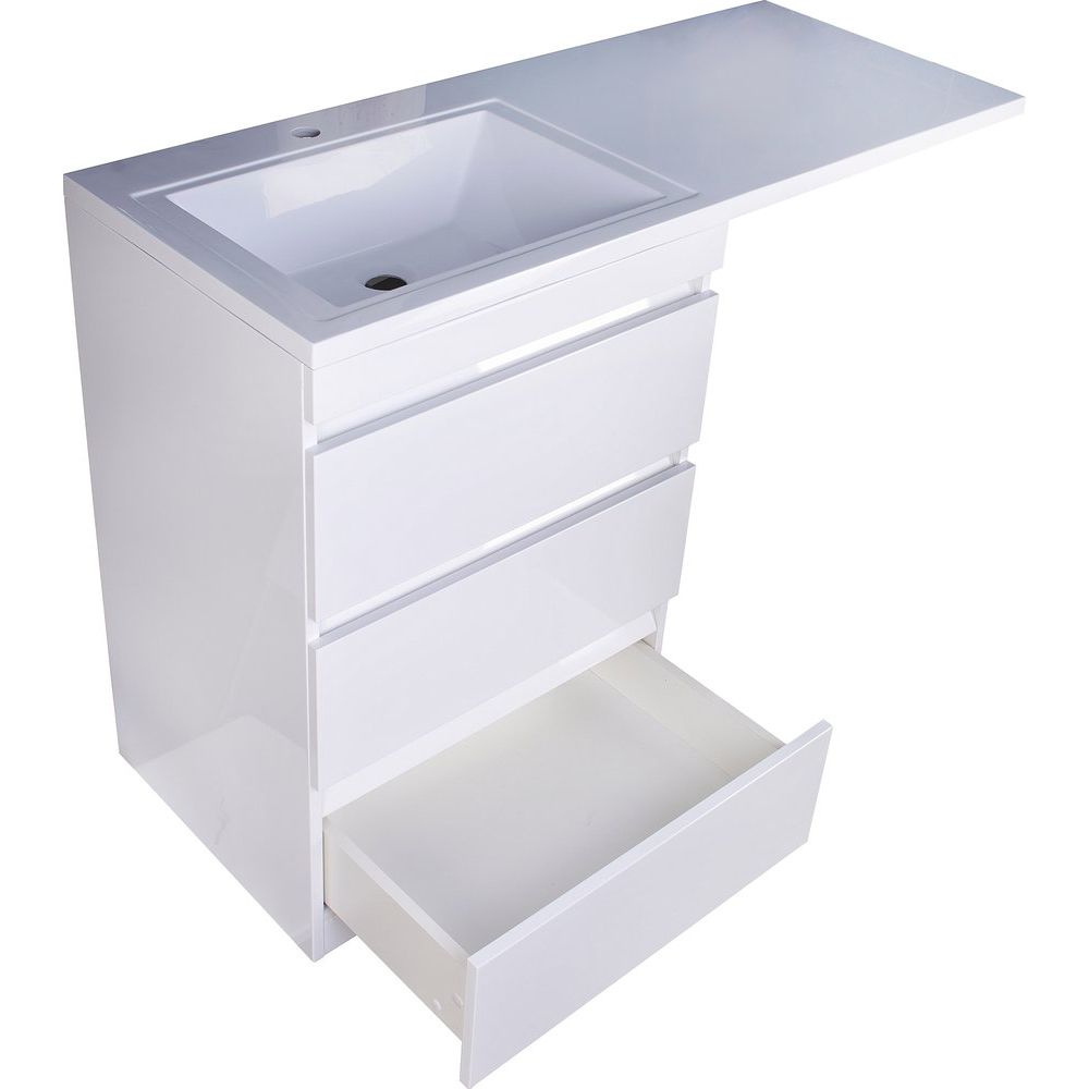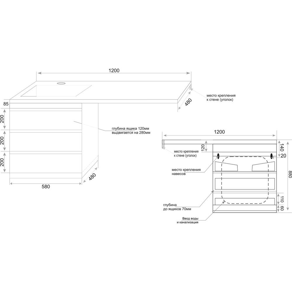 Тумба с раковиной включает напольную тумбу размером 58x48x85,5 см с тремя ящиками. Корпус и фасад выполнены из высококачественного МДФ, покрытого пленкой, что обеспечивает устойчивость к влаге. Ящики оснажены механизмом доводчика для мягкого закрывания. Модель укомплектована хромированной фурнитурой и опорными ножками.