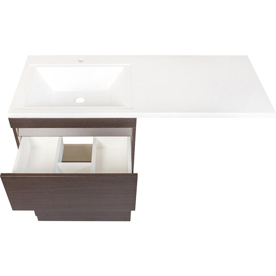 Напольная тумба Style Line Даллас 120 Люкс Plus отличается компактными размерами: 58x48x85,5 см и оснащена механизмом доводчика для плавного закрывания. Корпус и фасады выполнены из влагостойкого МДФ с покрытием из пленки, забота о долговечности обеспечивается использованием материала Kronospan и кромочного материала Rehau толщиной 4 мм. Внутренние ящики из ЛДСП собираются с помощью евровинтов, что увеличивает срок службы мебели. Раковина ESTETUS Даллас 120 L из искусственного камня, габаритами 120,2x48,2 см, оснащена кронштейном и имеет одно отверстие под смеситель, что позволяет устанавливать её над стиральной машиной. Комплект поставляется с ножками и навесами, гарантия на тумбу составляет 1 год, на раковину – 5 лет. Производство – Россия.